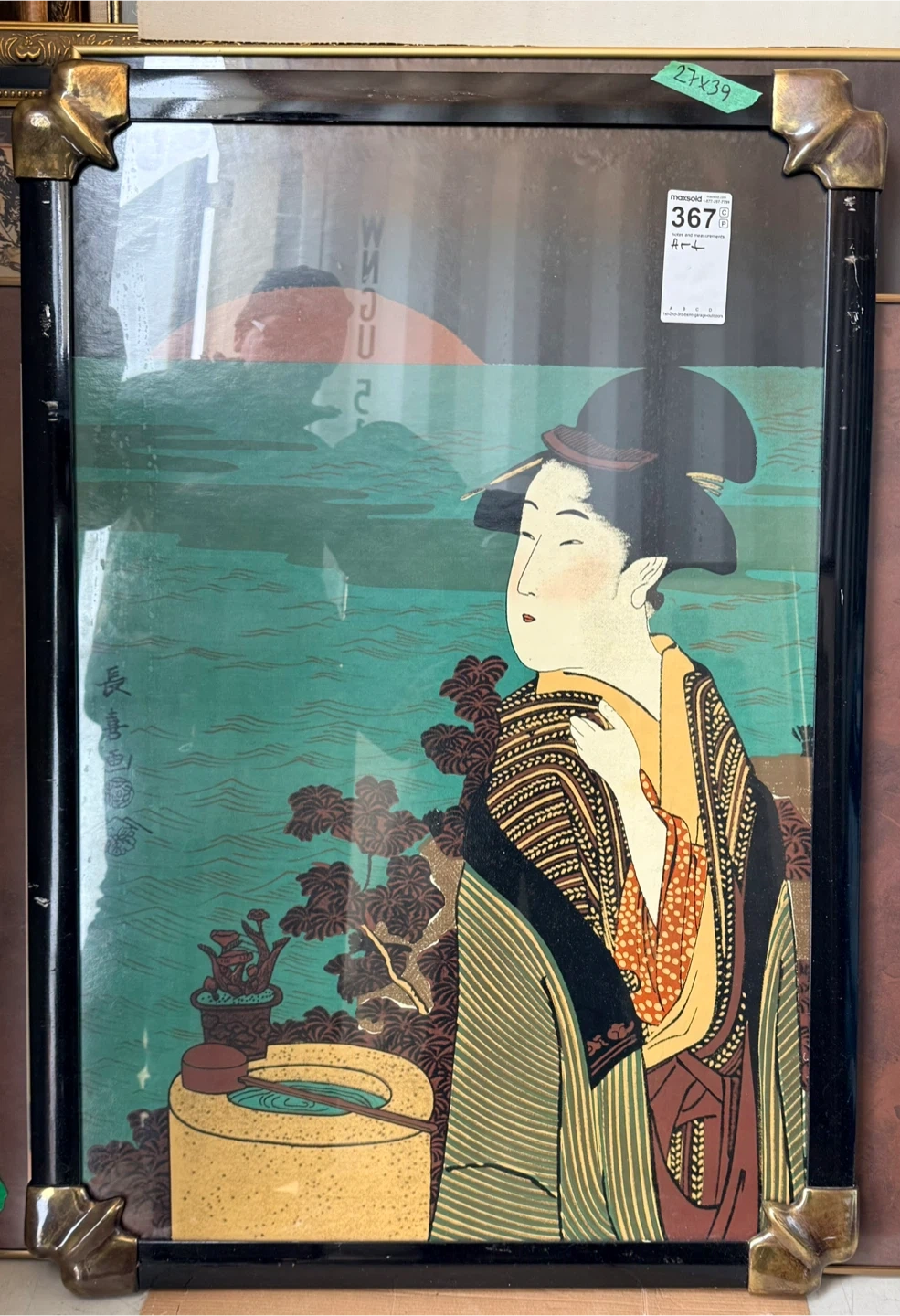 Here's a framed art print featuring a Japanese woman in traditional clothing against a teal background. The frame is black with ornate gold-tone corners. It's a beautiful piece to add some cultural flair to your home decor