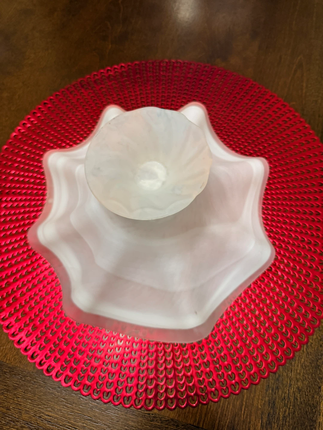 Here's a lovely decorative glass bowl, perfect for adding a touch of elegance to your home. It features a beautiful swirl of white and pink, creating a soft and inviting look. It would look great as a centrepiece or on a side table
