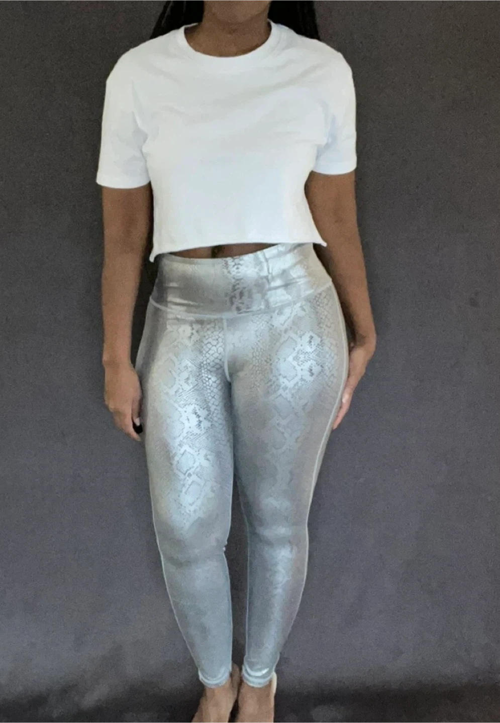 These leggings feature a striking silver snake print design!