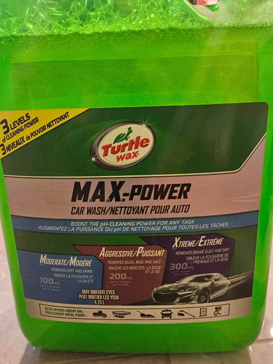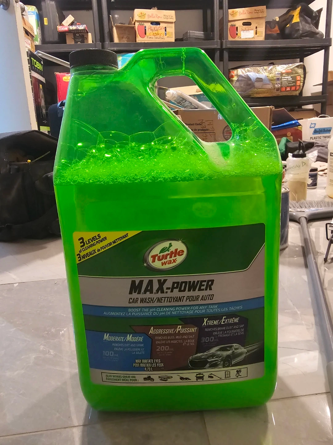 Selling a jug of Turtle Wax MAX-POWER car wash. It boosts the pH-cleaning power for any task and removes dirt, grime, bugs, mud, salt, brake dust, and sap. It also works great on cars, garages, and ideal for homes