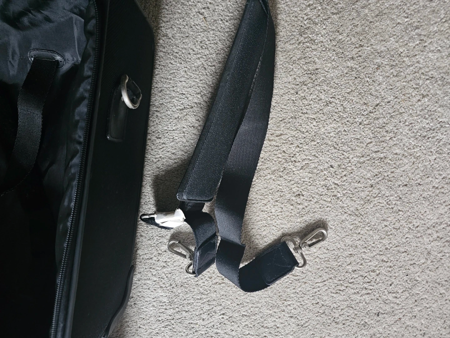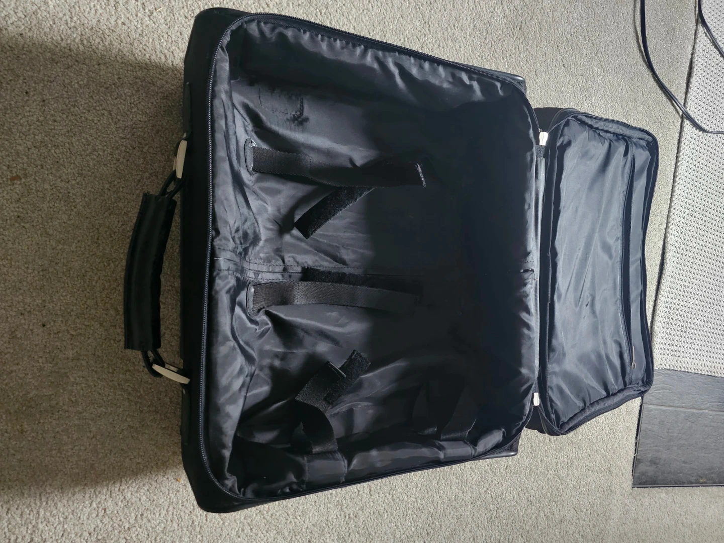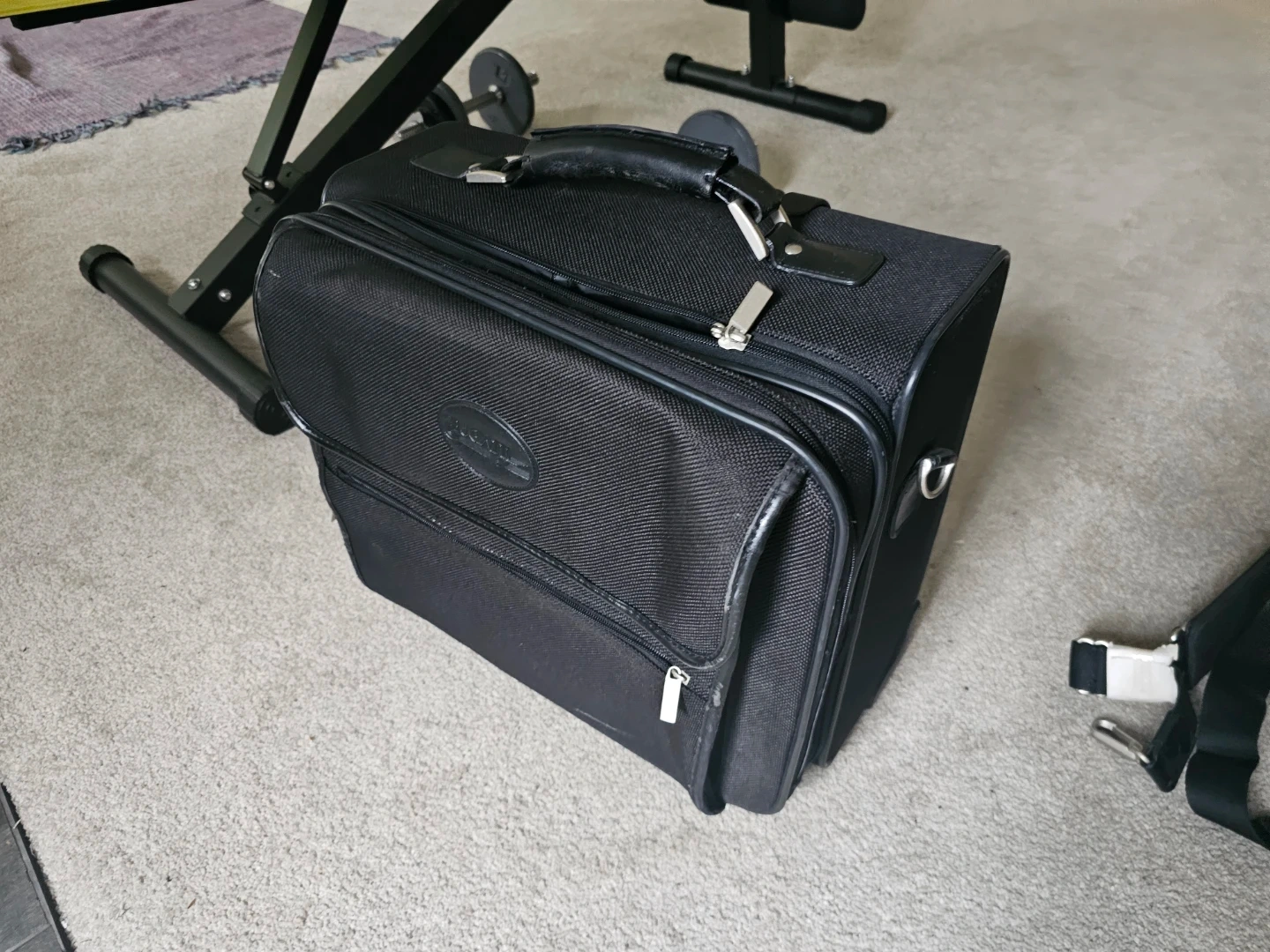 Selling a black rolling suitcase from Bugatti. It has a handle and wheels for easy transport, plus a shoulder strap if you prefer to carry it. Great for travel or storage!