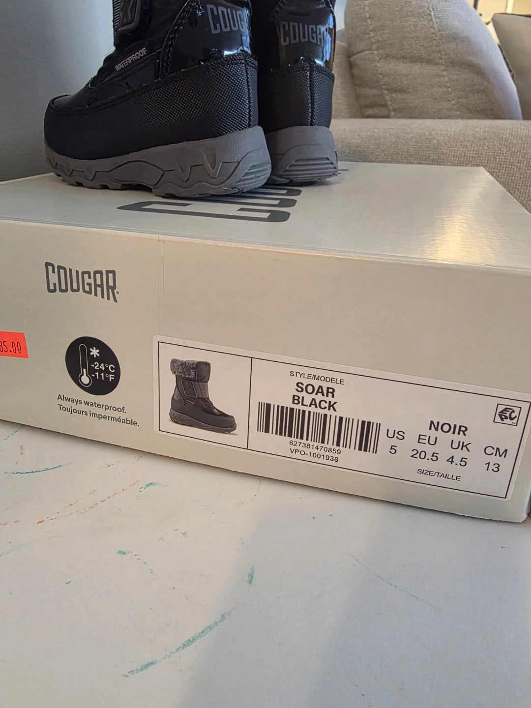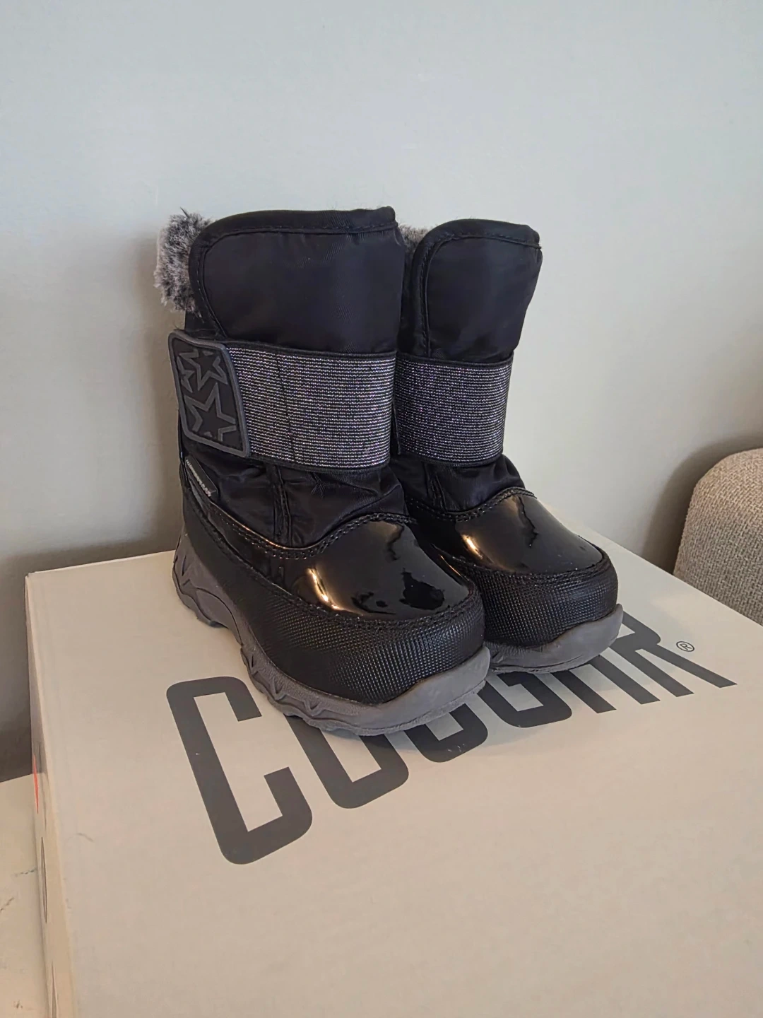 Selling a pair of Cougar Soar winter boots in black. They are waterproof and perfect for cold weather! The box indicates the size is US 5 / EU 20.5 / UK 4.5 / CM 13. They are also rated for temperatures down to -24°C / -11°F. Comes with the original box