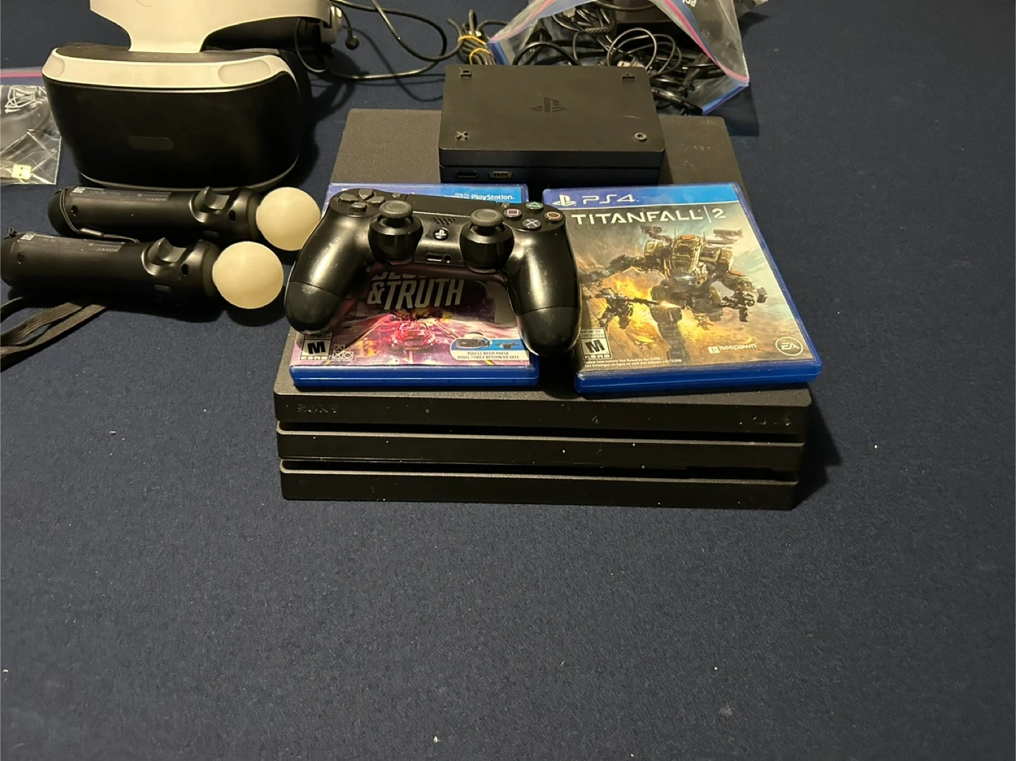 Selling a PlayStation VR bundle! Includes the headset, two move controllers, a PlayStation 4 pro, and two games: Everybody's Golf and Titanfall 2. All the necessary cables are included as well, so you're ready to jump into virtual reality gaming!