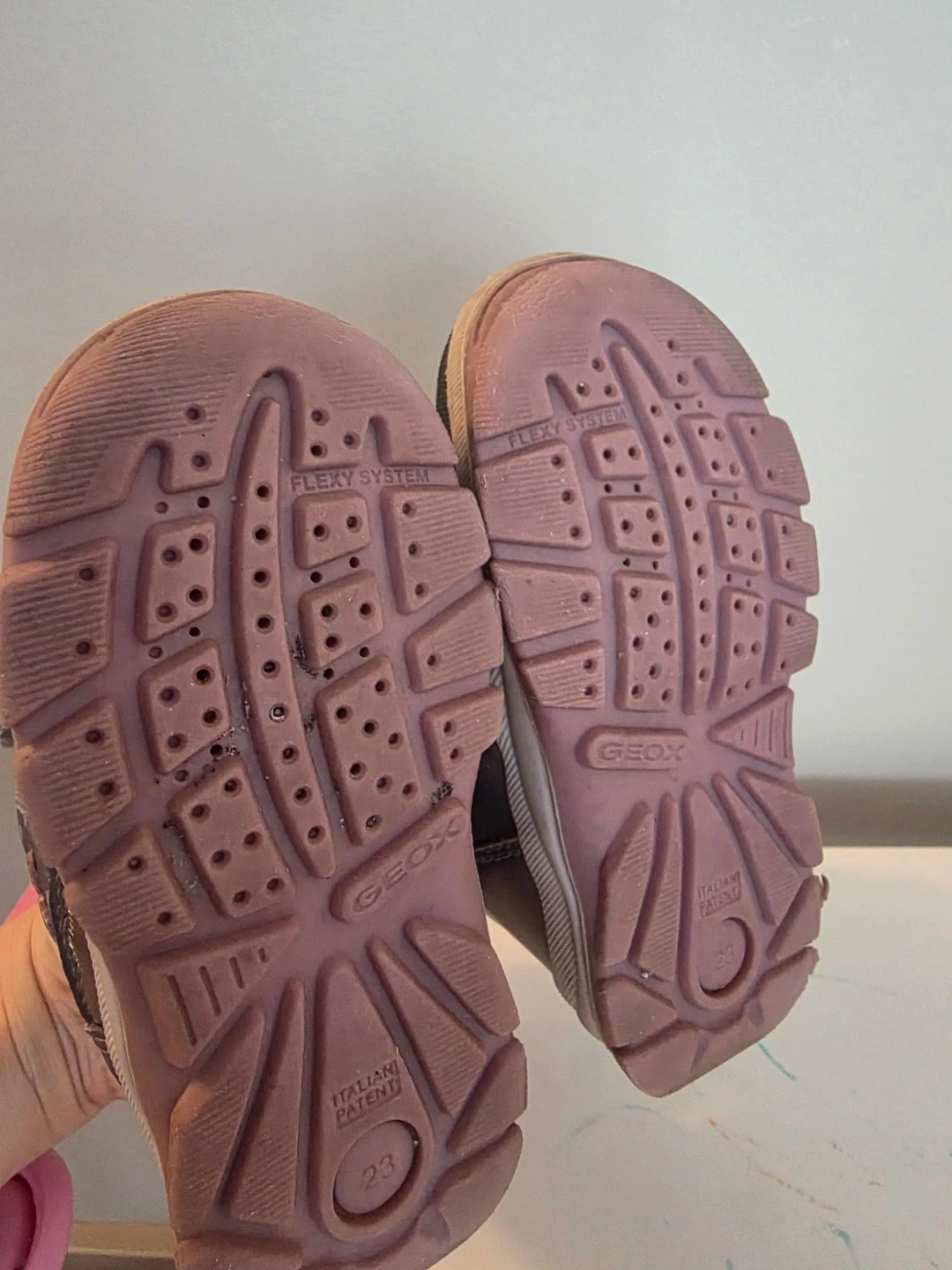 Selling a pair of Geox toddler girl boots in size 7. They feature a cute polka dot design with a silver and grey colour scheme, and a pink flower detail. The soles have Geox's flexy system.