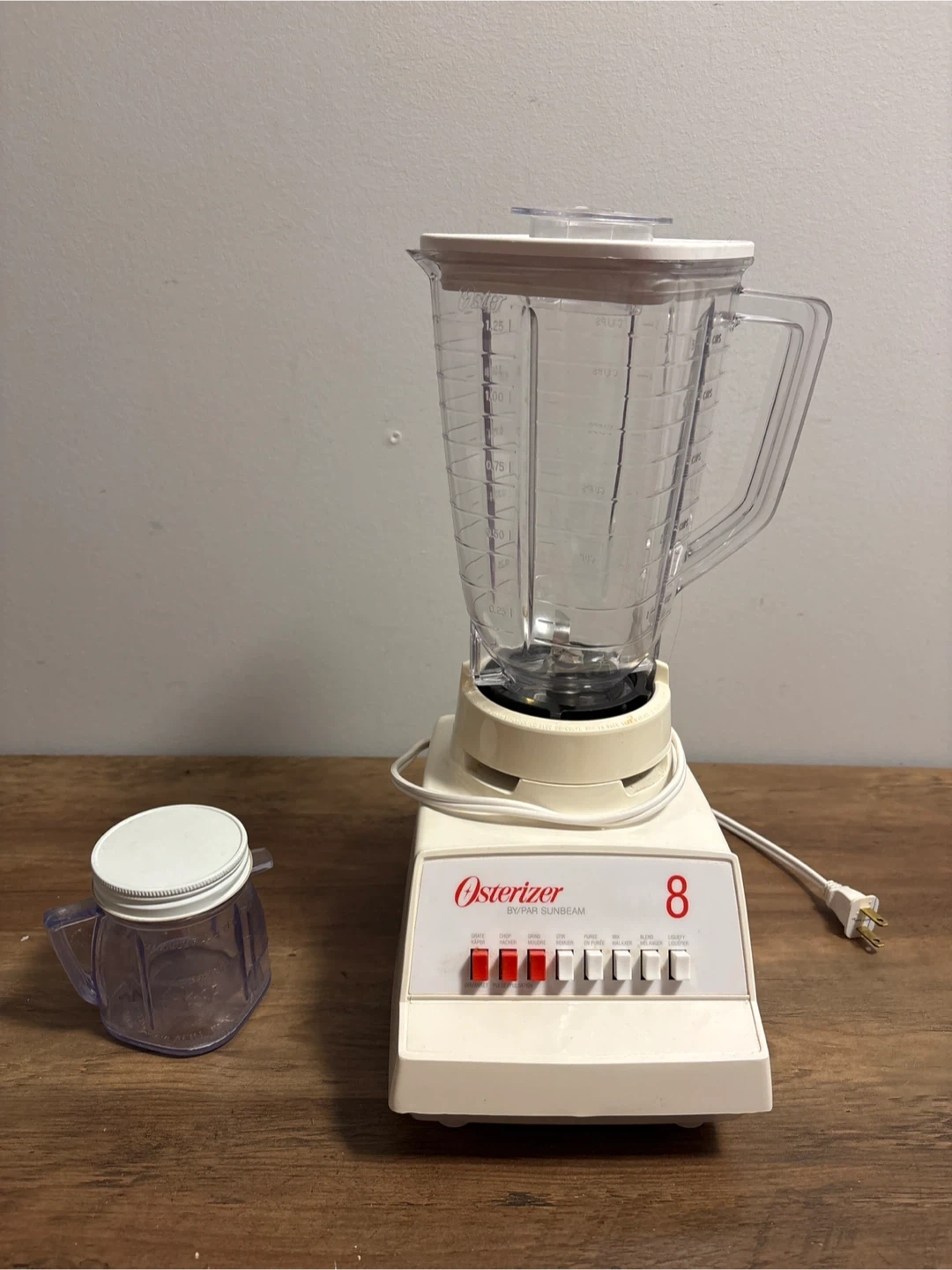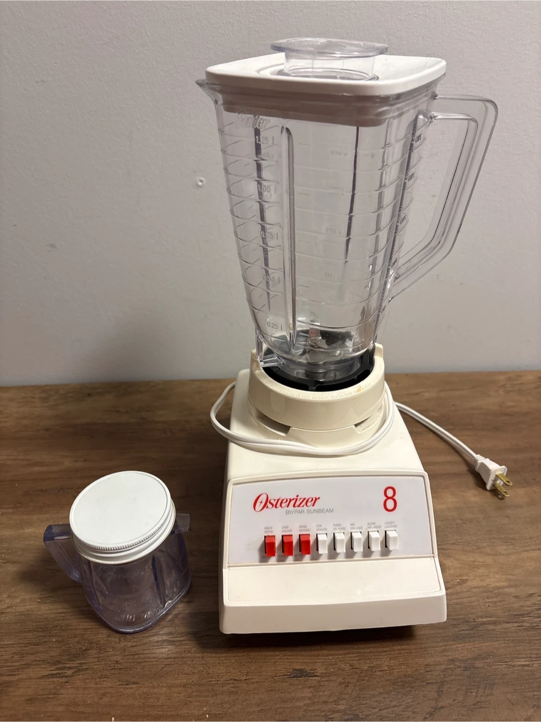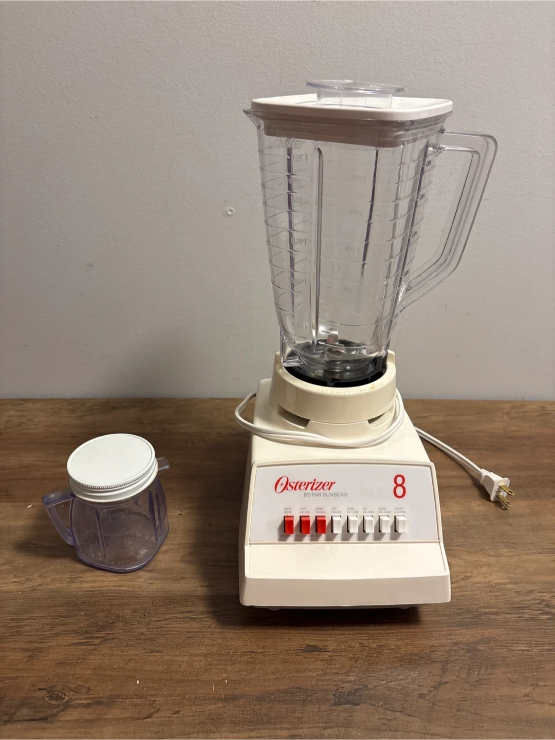 Selling an Osterizer blender with a measuring cup attachment. It's in good condition and ready for a new kitchen! Perfect for smoothies and more