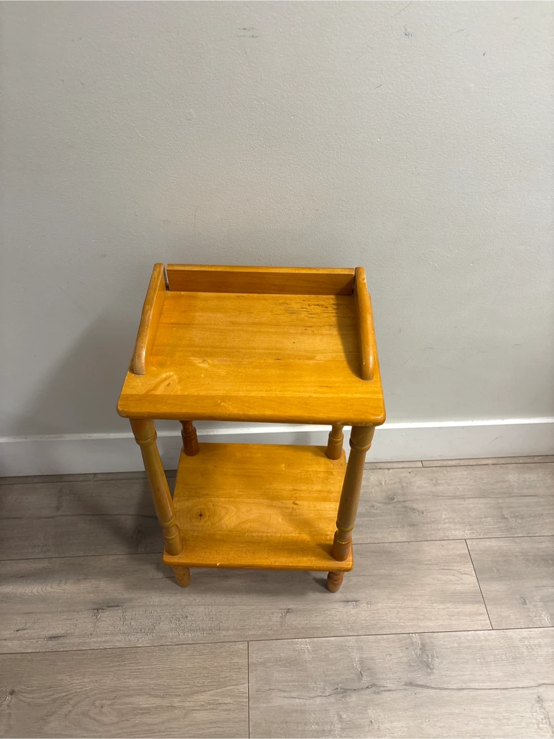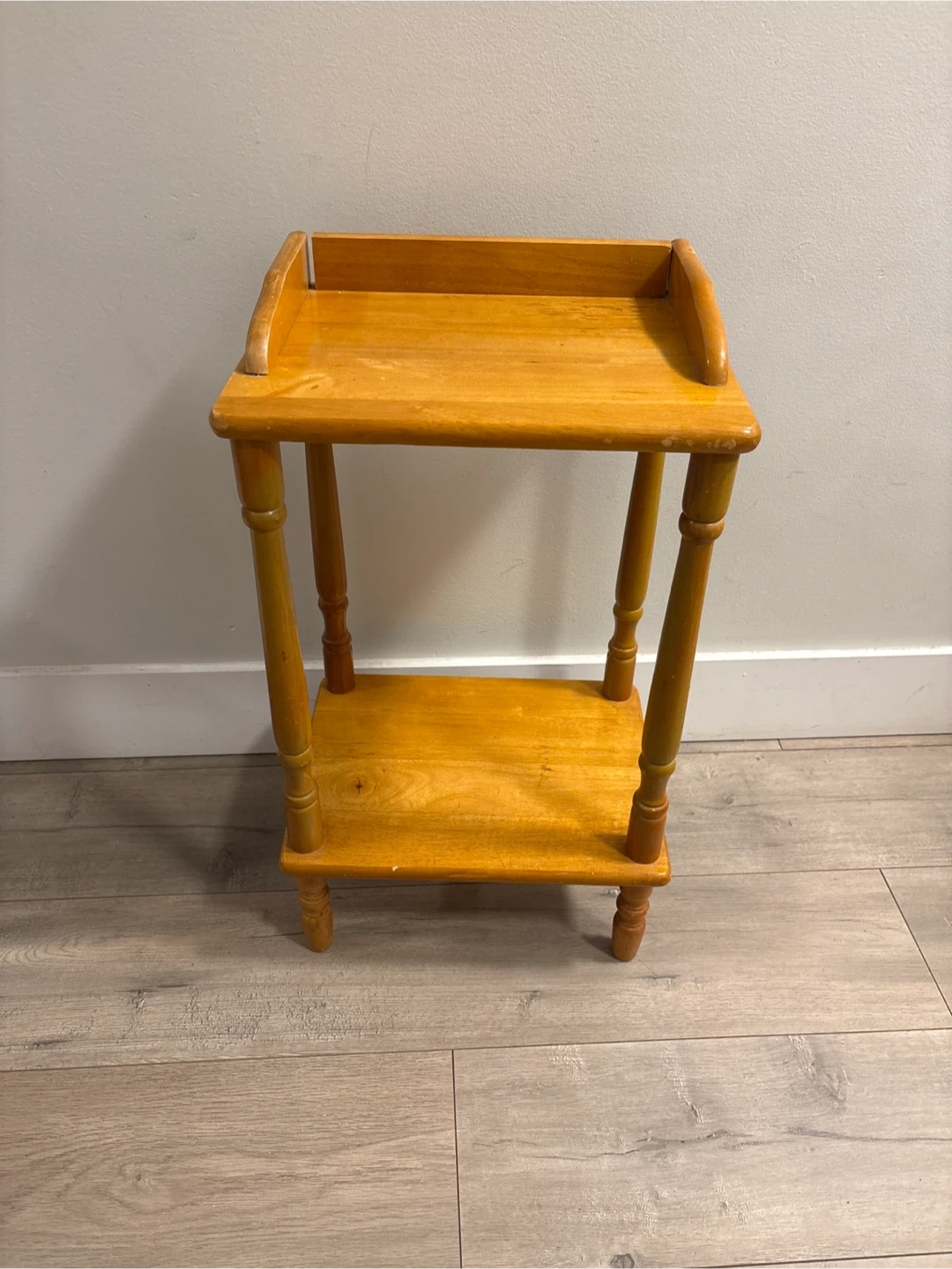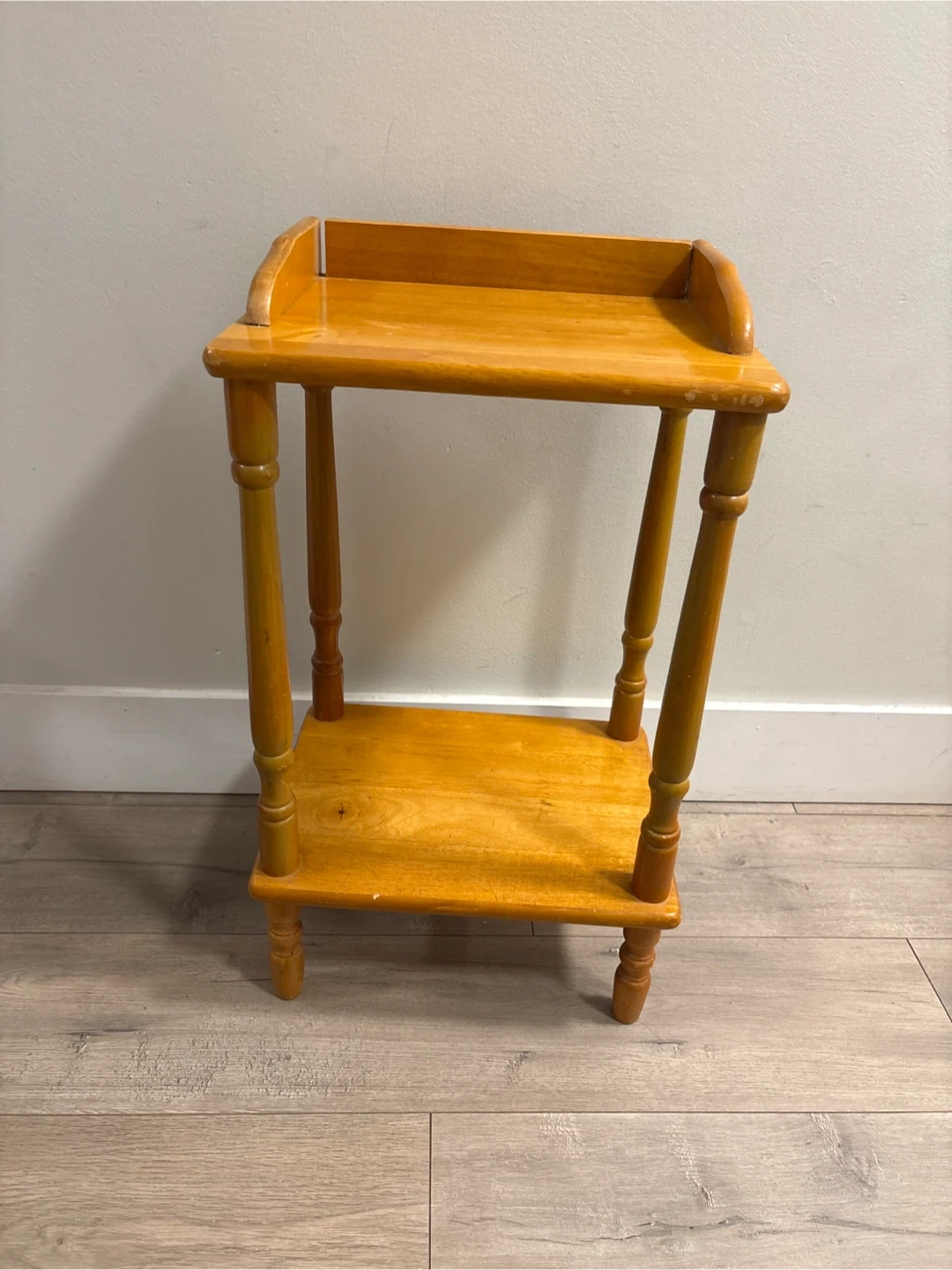 A cute little wooden side table with two tiers! It's perfect for a small space or as a bedside table. The wood has a nice warm tone.