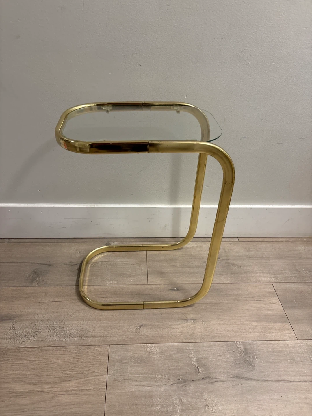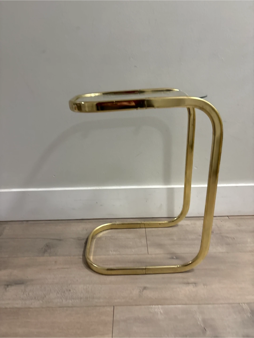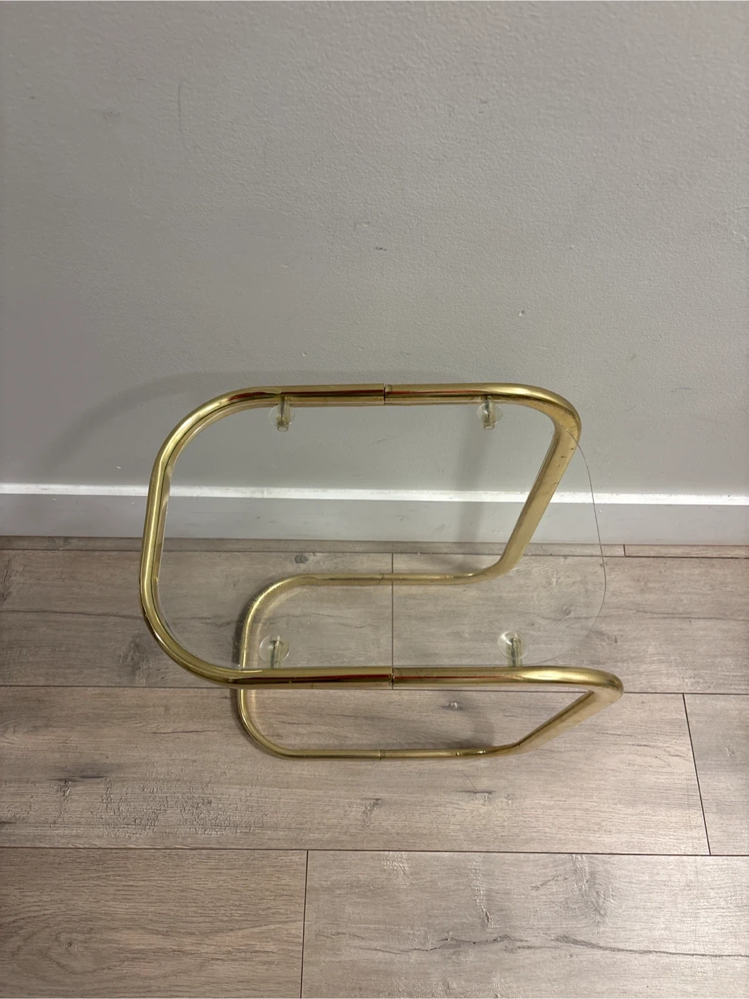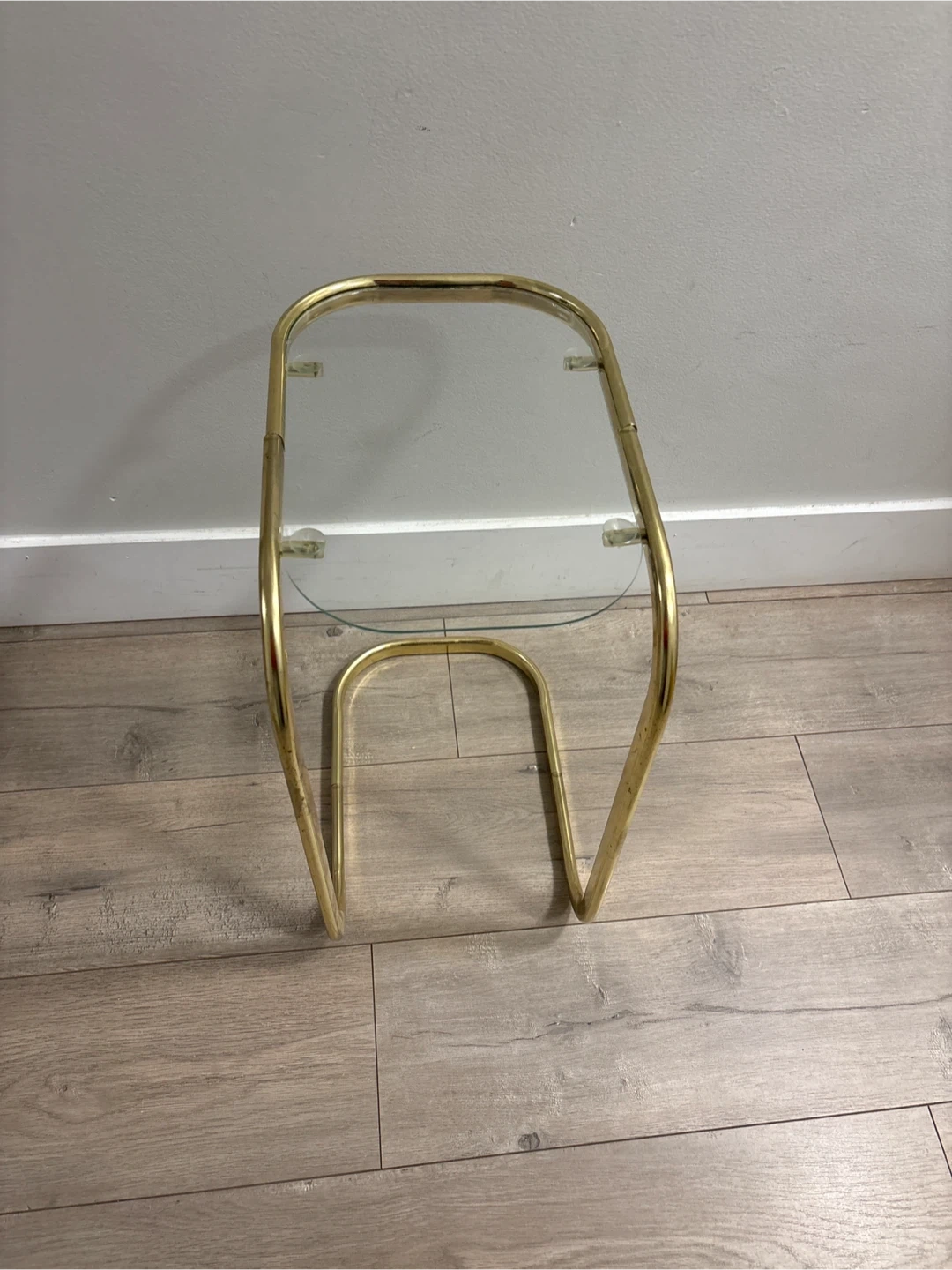 Selling a brass side table with a glass top. It's in great condition and would be a lovely addition to any living space!
