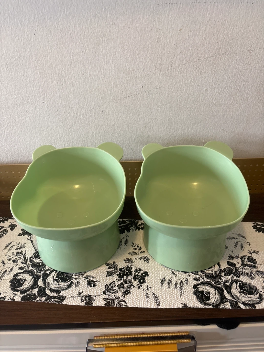 Selling a set of two adorable pet bowls! They're in a lovely light green colour and feature a cute bear-shaped design with little ears. Perfect for small dogs or cats, these bowls are elevated to make feeding time more comfortable for your furry friends