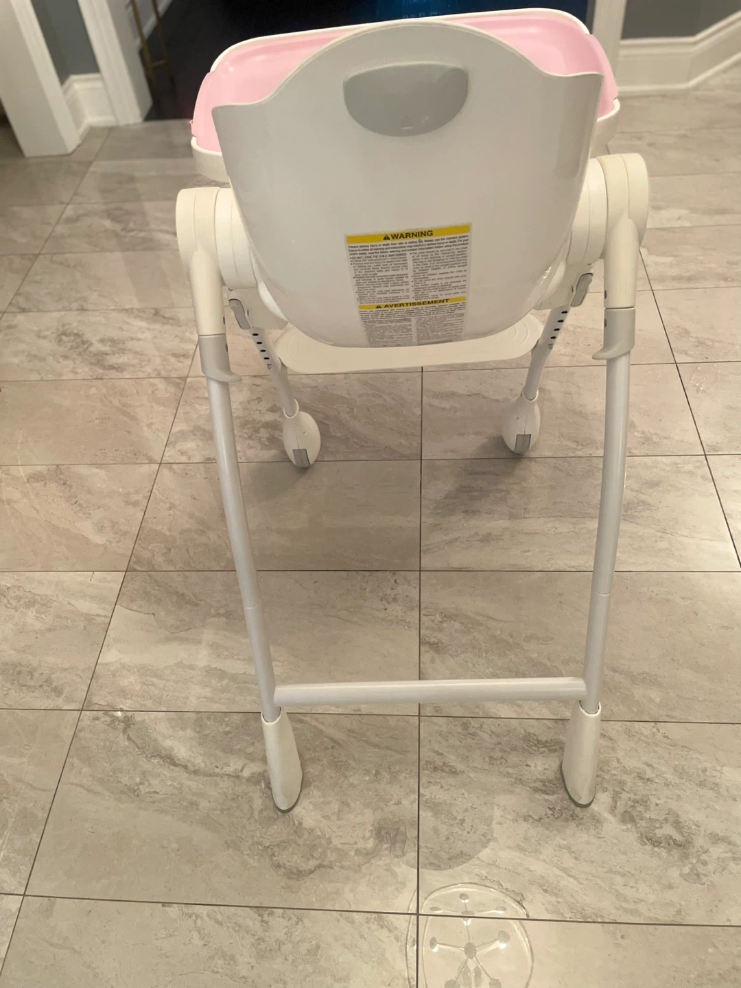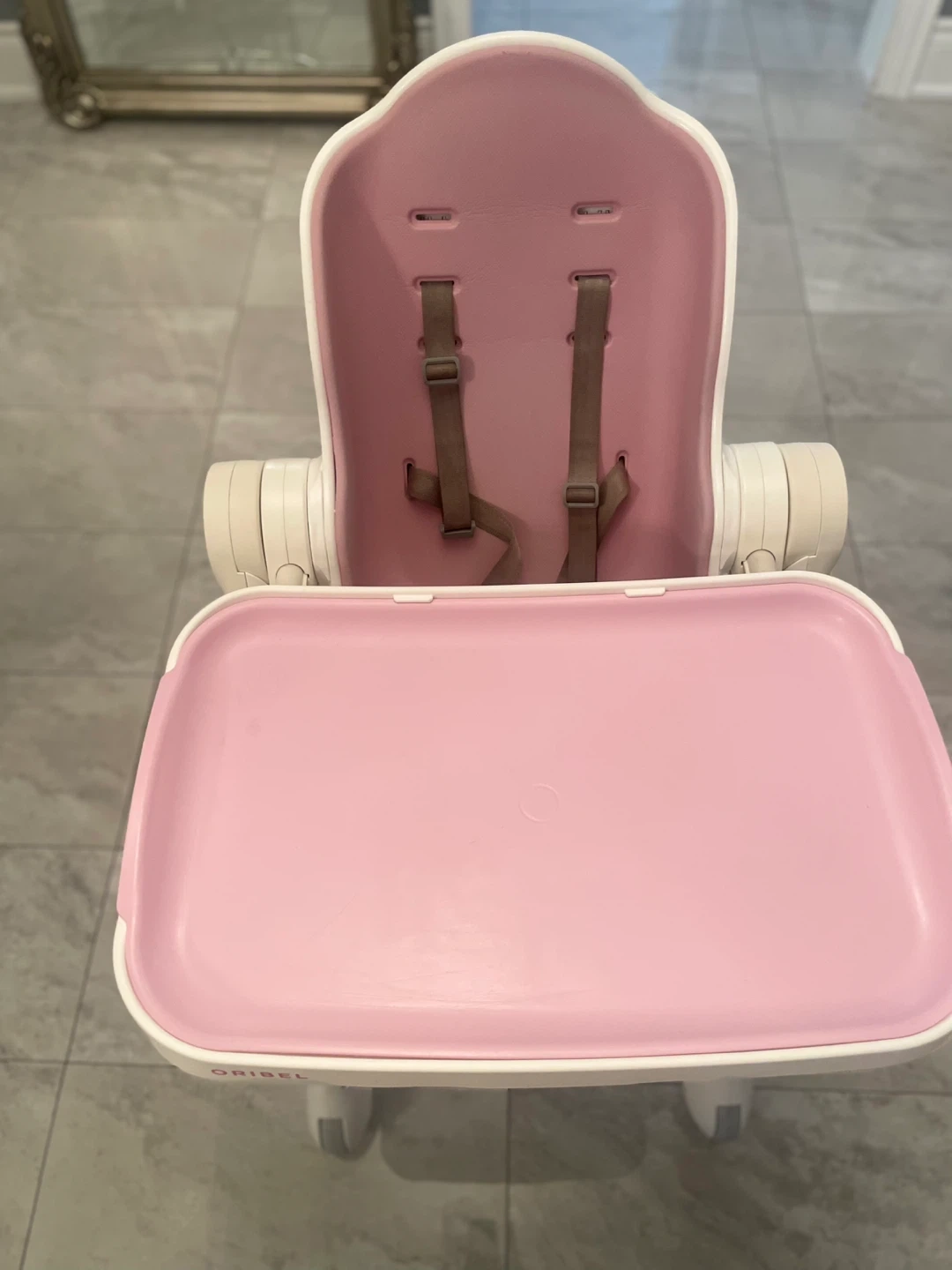 Selling a gently used Oribel Cocoon Z high chair in pink. It's in great condition and comes with a tray and a cup holder attachment for added convenience
