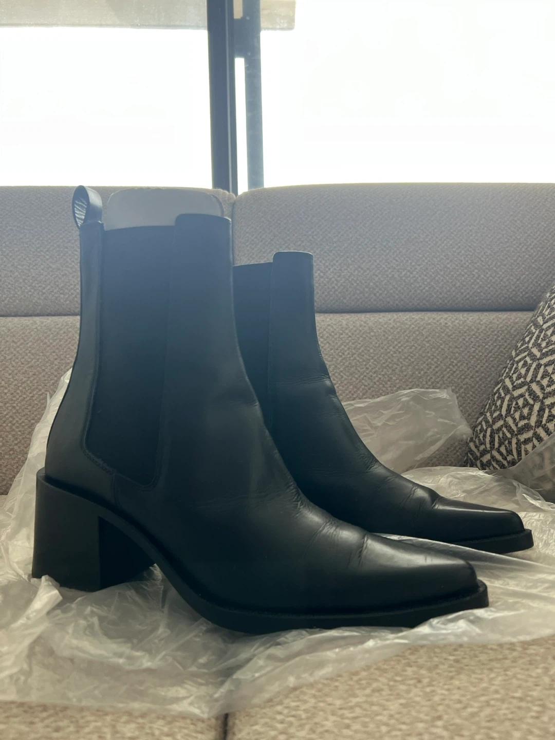 These are a pair of stylish black leather heeled Chelsea boots. They appear to be in good condition and ready for a new owner! They are a classic style that can be dressed up or down