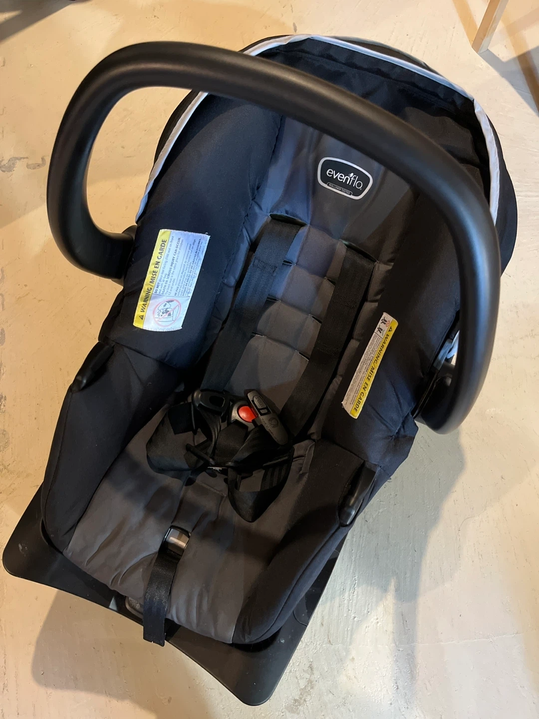 Selling an Evenflo infant car seat in black. It is in good condition and ready for a new family.