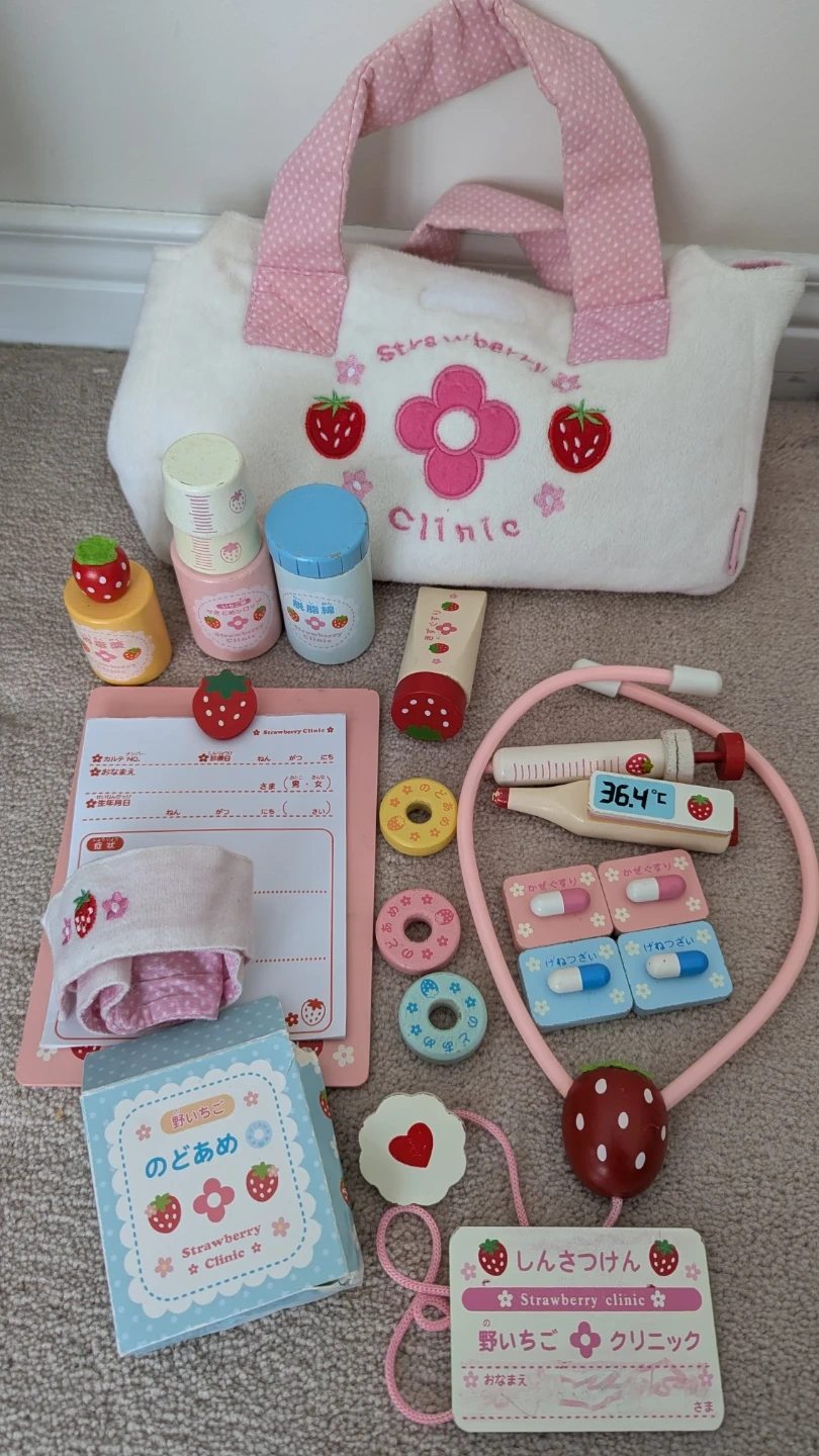 This adorable Strawberry Clinic doctor play set is perfect for your little one! It comes with a variety of wooden medical tools and accessories, including a stethoscope, thermometer, medicine bottles, and more. The set also includes a cute bag to store everything in. It's a great way to encourage imaginative play and help children learn about the medical field