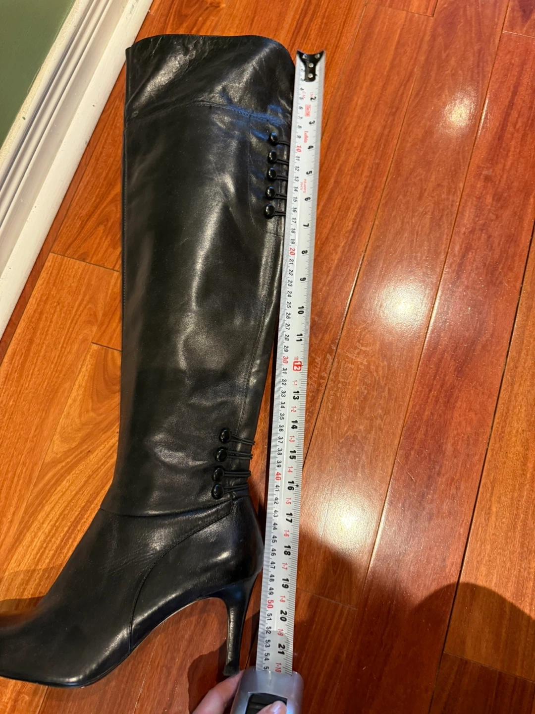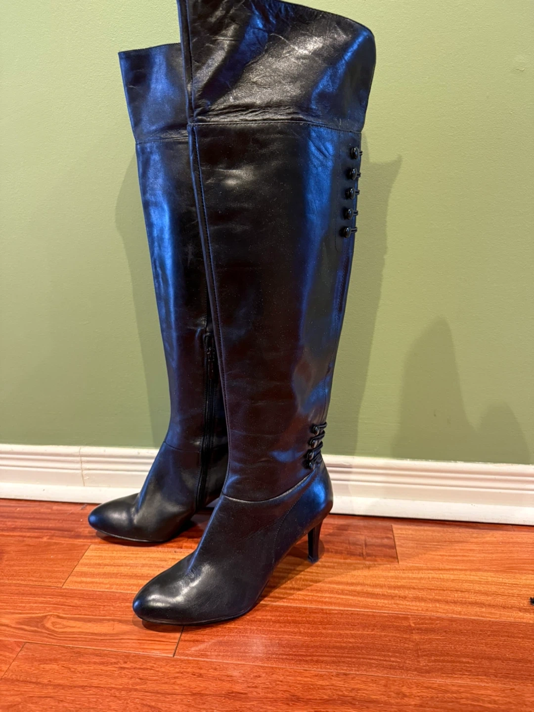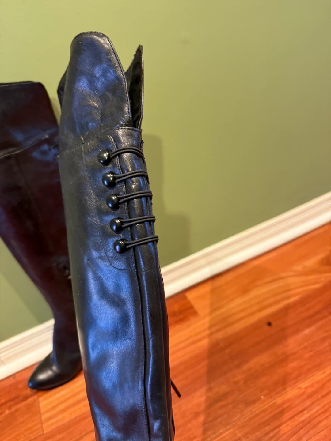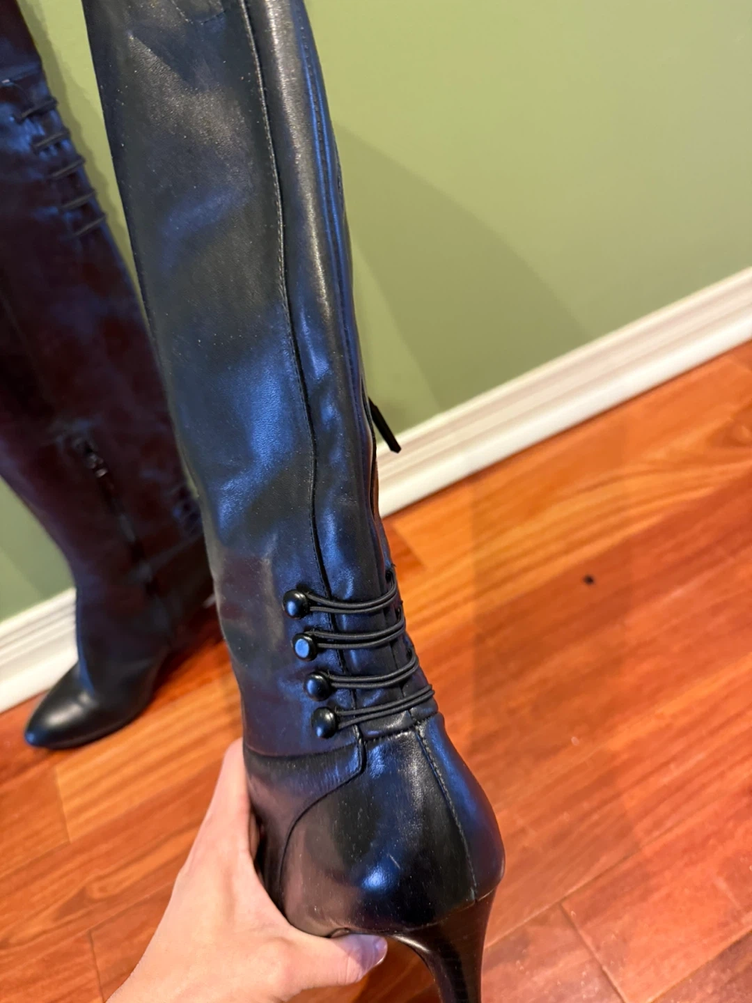 Selling a pair of stylish black leather thigh-high boots! They feature a sleek design with button detailing on the back. Perfect for adding a touch of elegance to any outfit. They are in great condition!