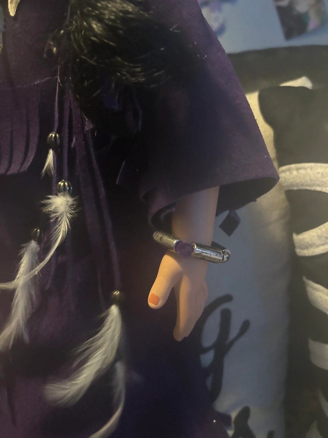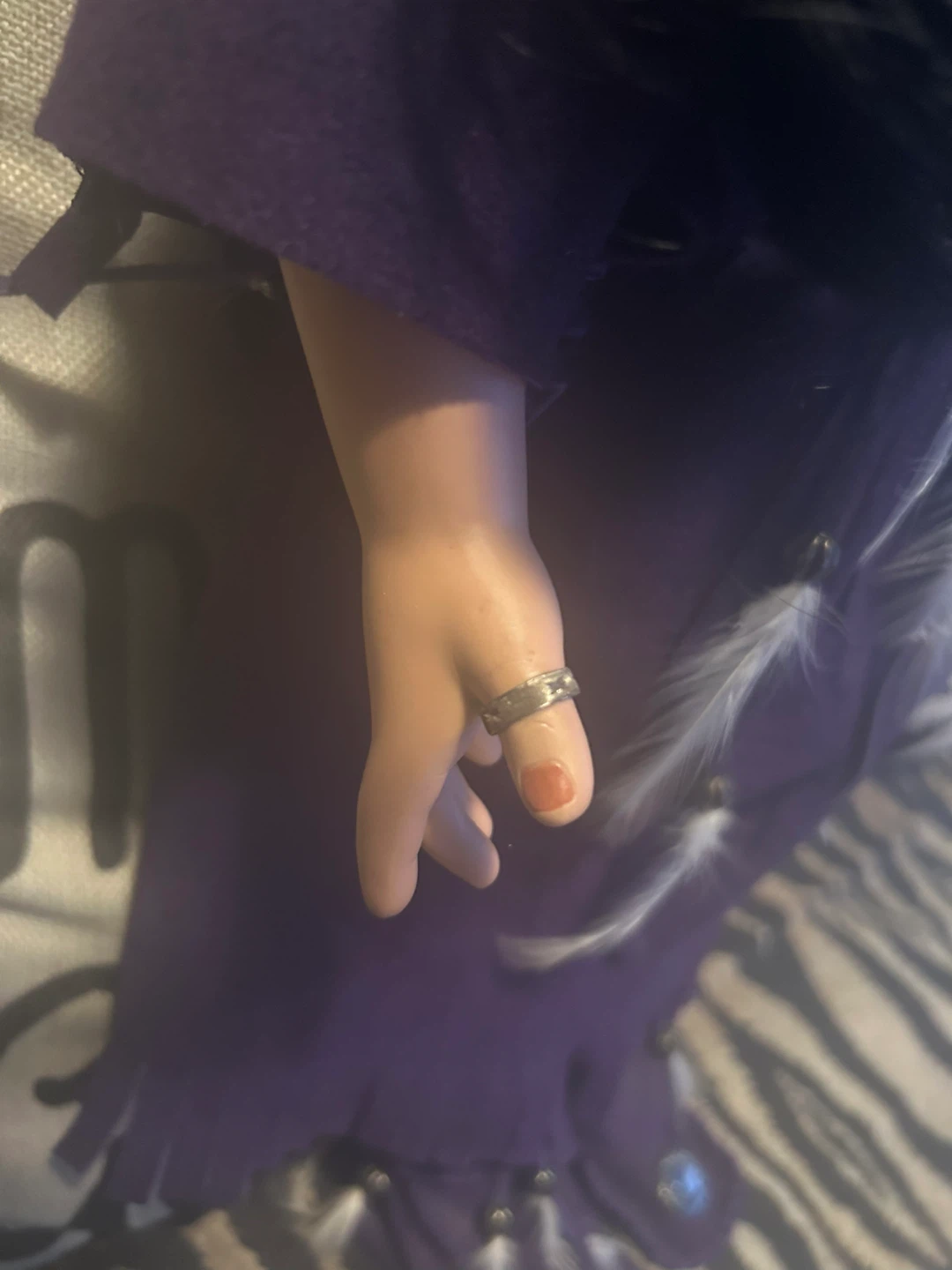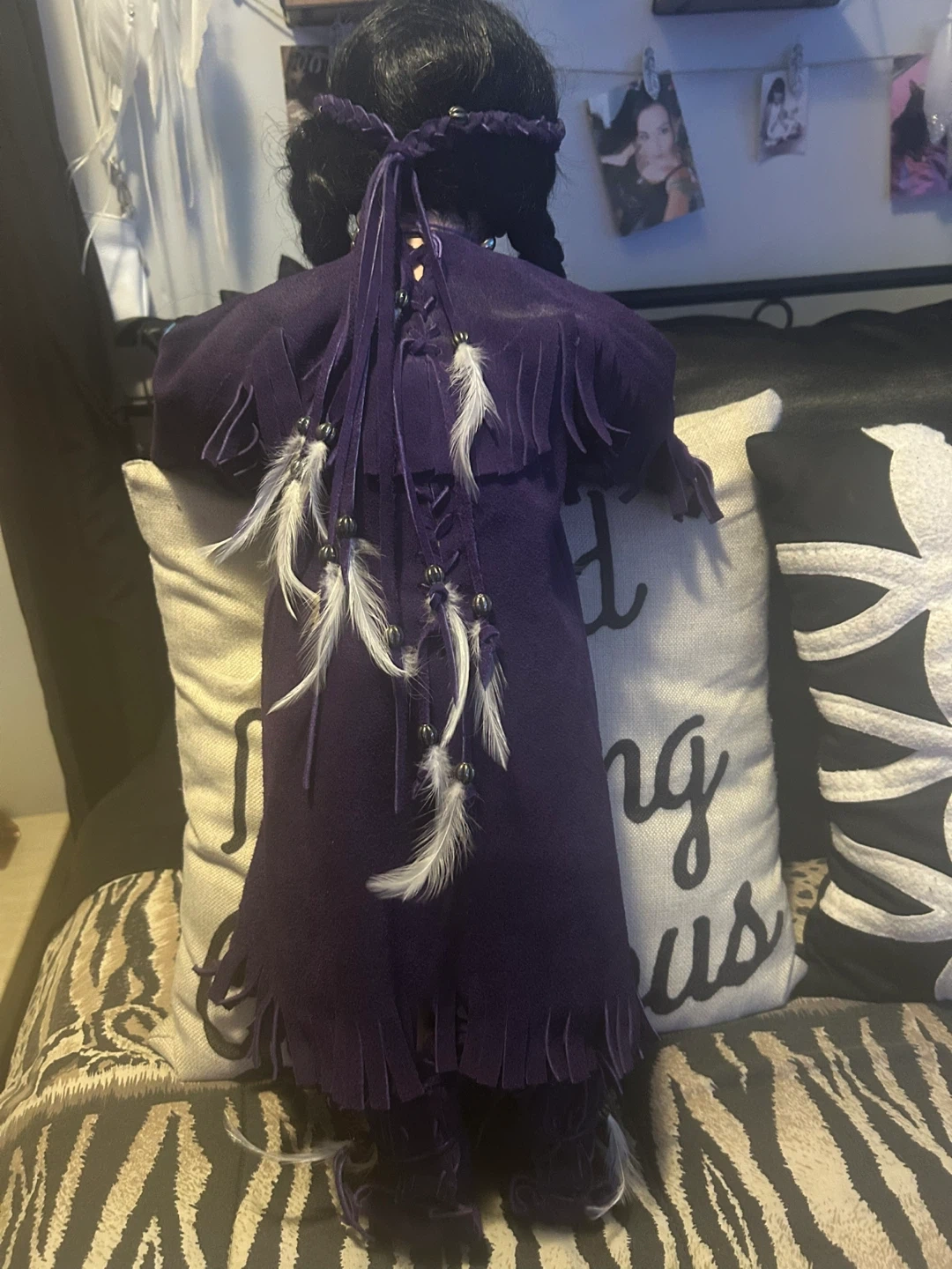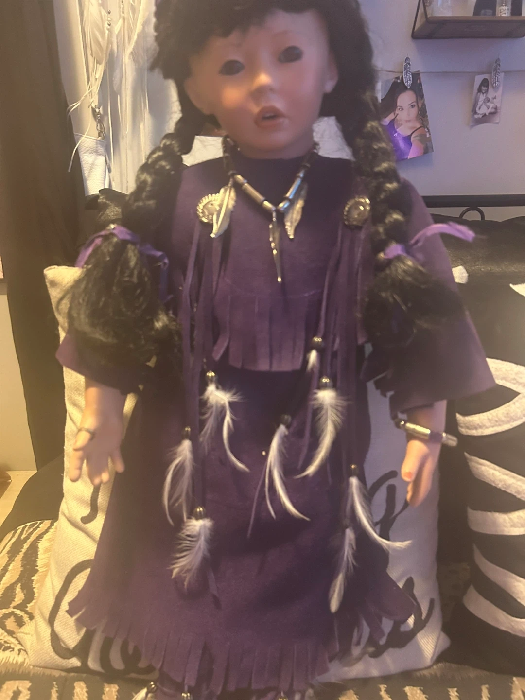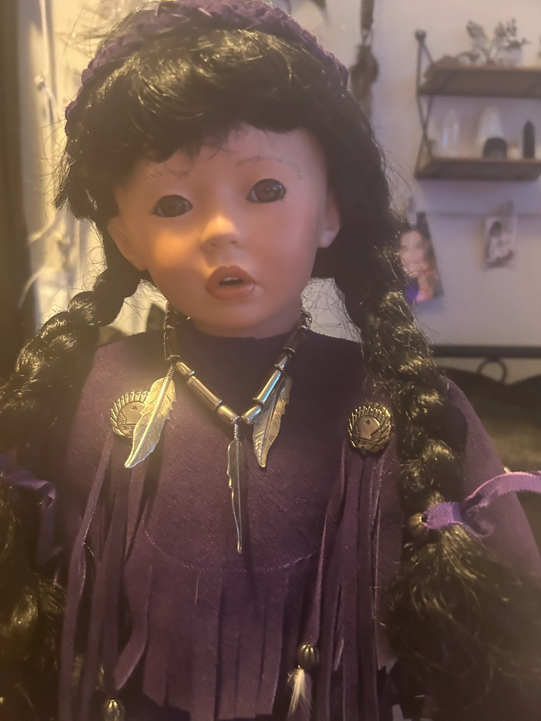 This is a Native American porcelain doll wearing a purple dress with purple moccasins with some jewellery necklace ring bracelet hair ties. She is absolutely gorgeous and would make a nice piece to anyone’s collection one of a kind.You won’t find her anywhere else she is beyond beautiful 😍 open to offers but no low ballers please 🙏