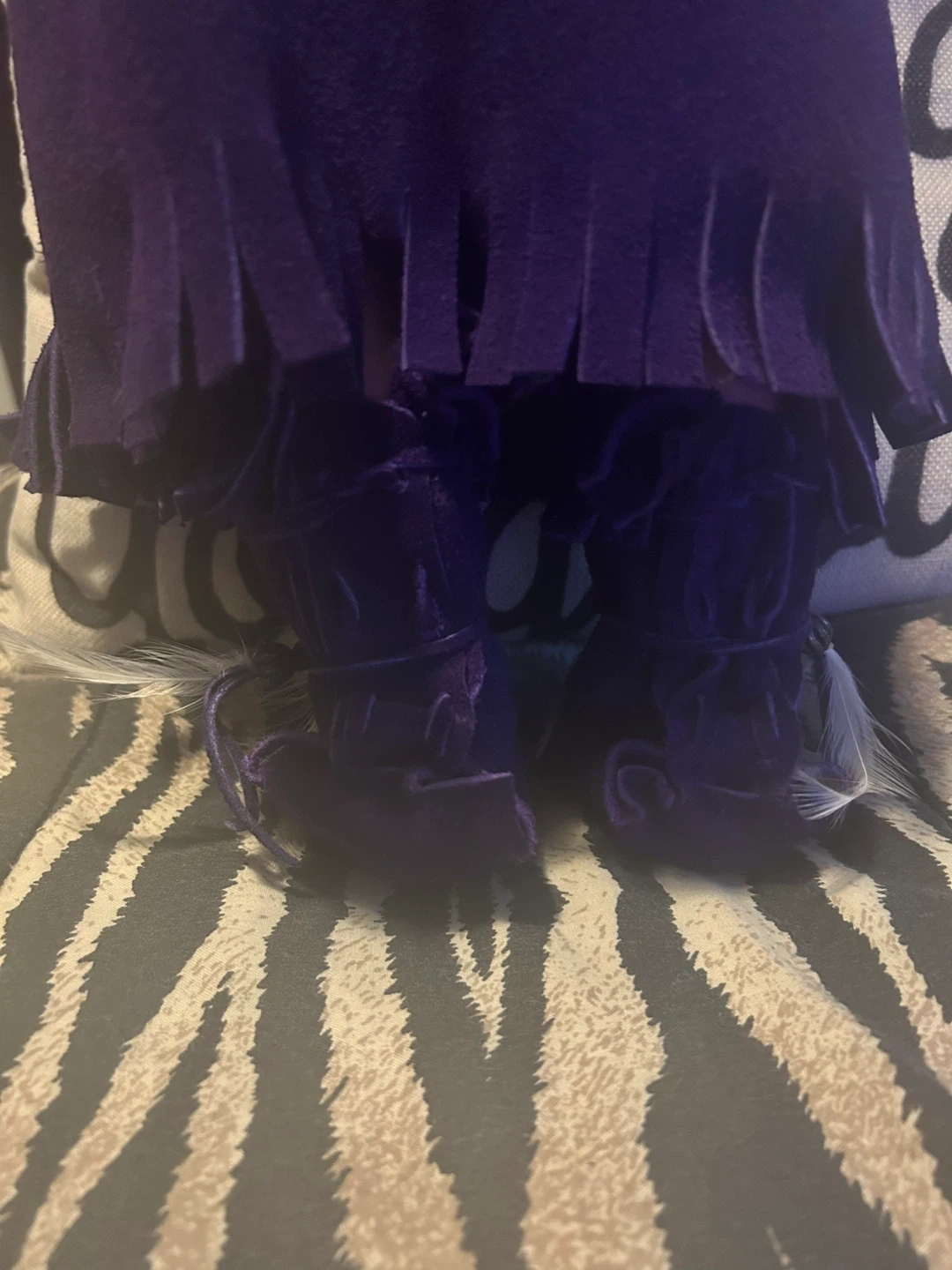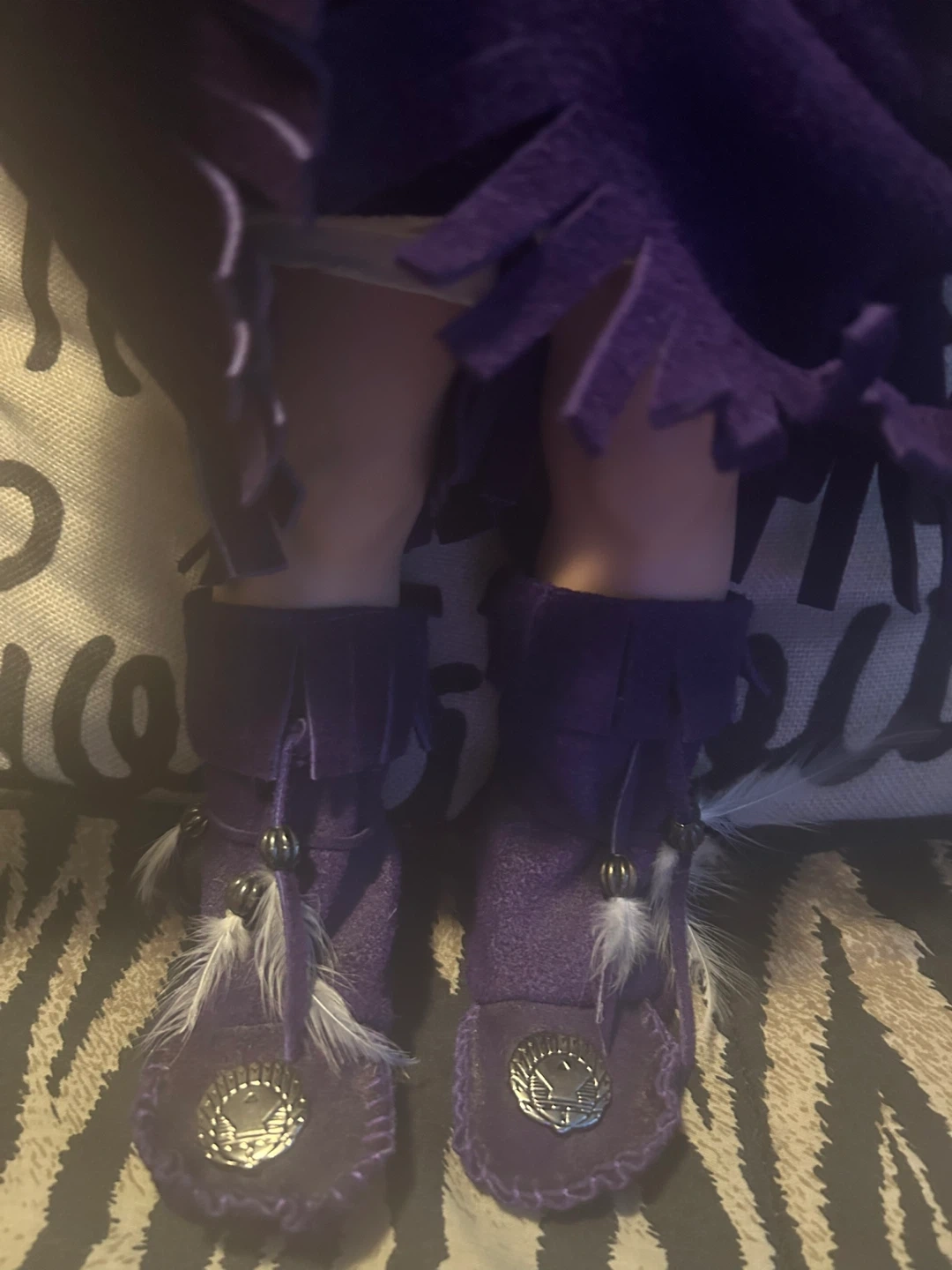Native porcelain doll and purple leather outfit with moccasins