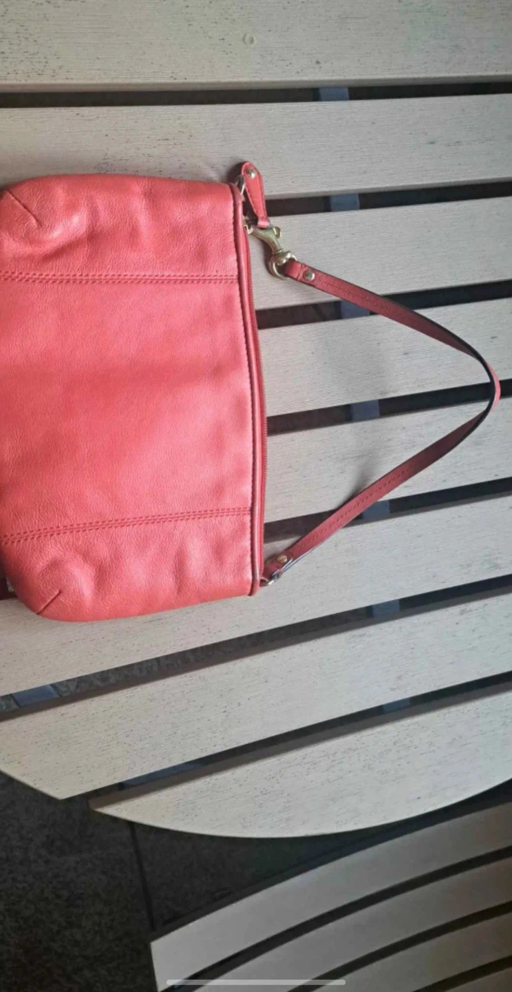 This is a coral-coloured Coach wristlet. It's perfect for carrying your essentials when you don't want to lug around a big purse. It is in good condition with some signs of wear.