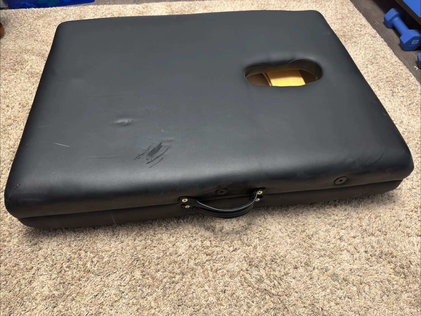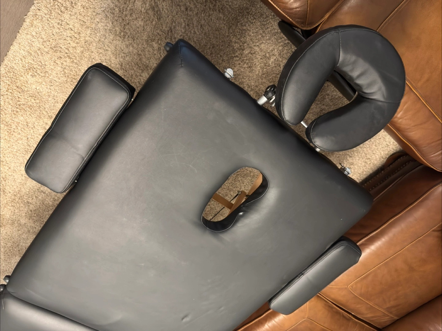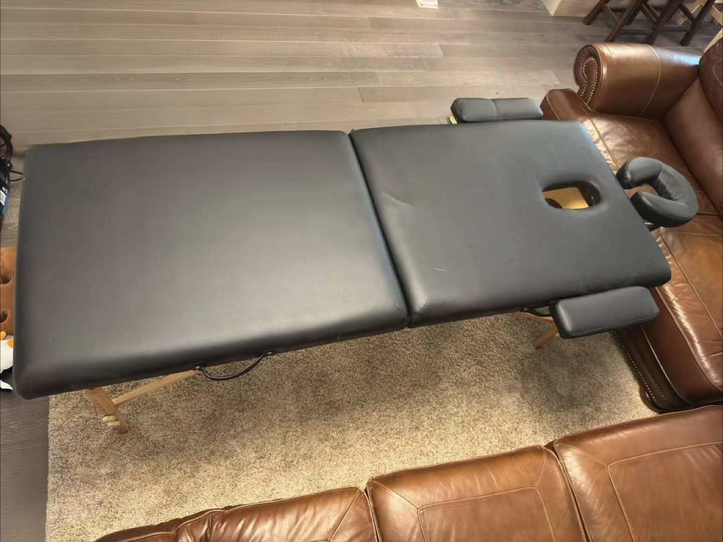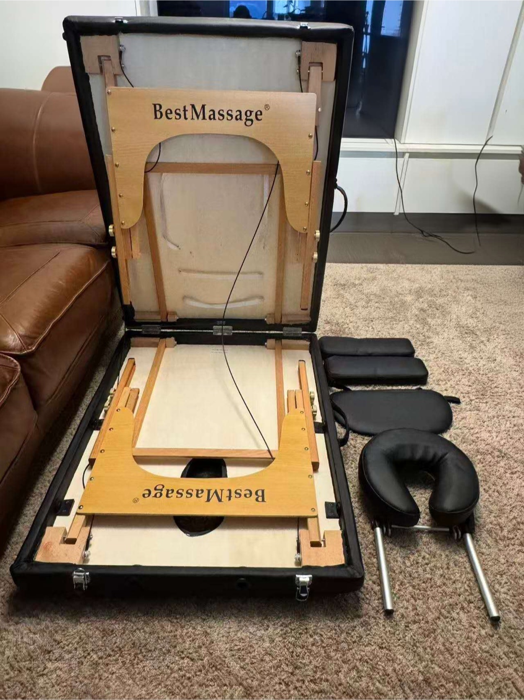 Selling a portable massage table in black! It comes with all the accessories you see in the photos, including the headrest and armrests.