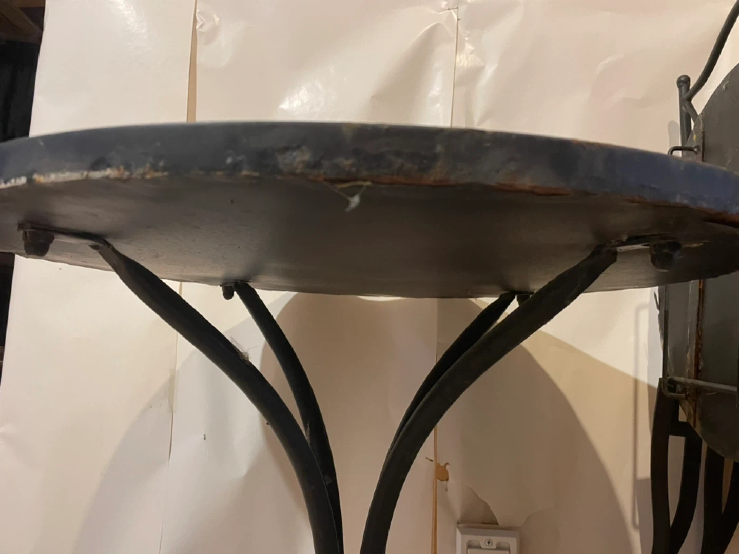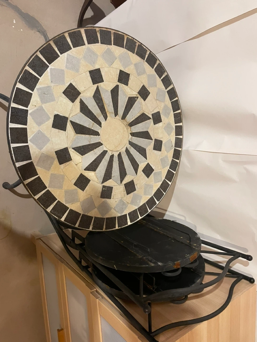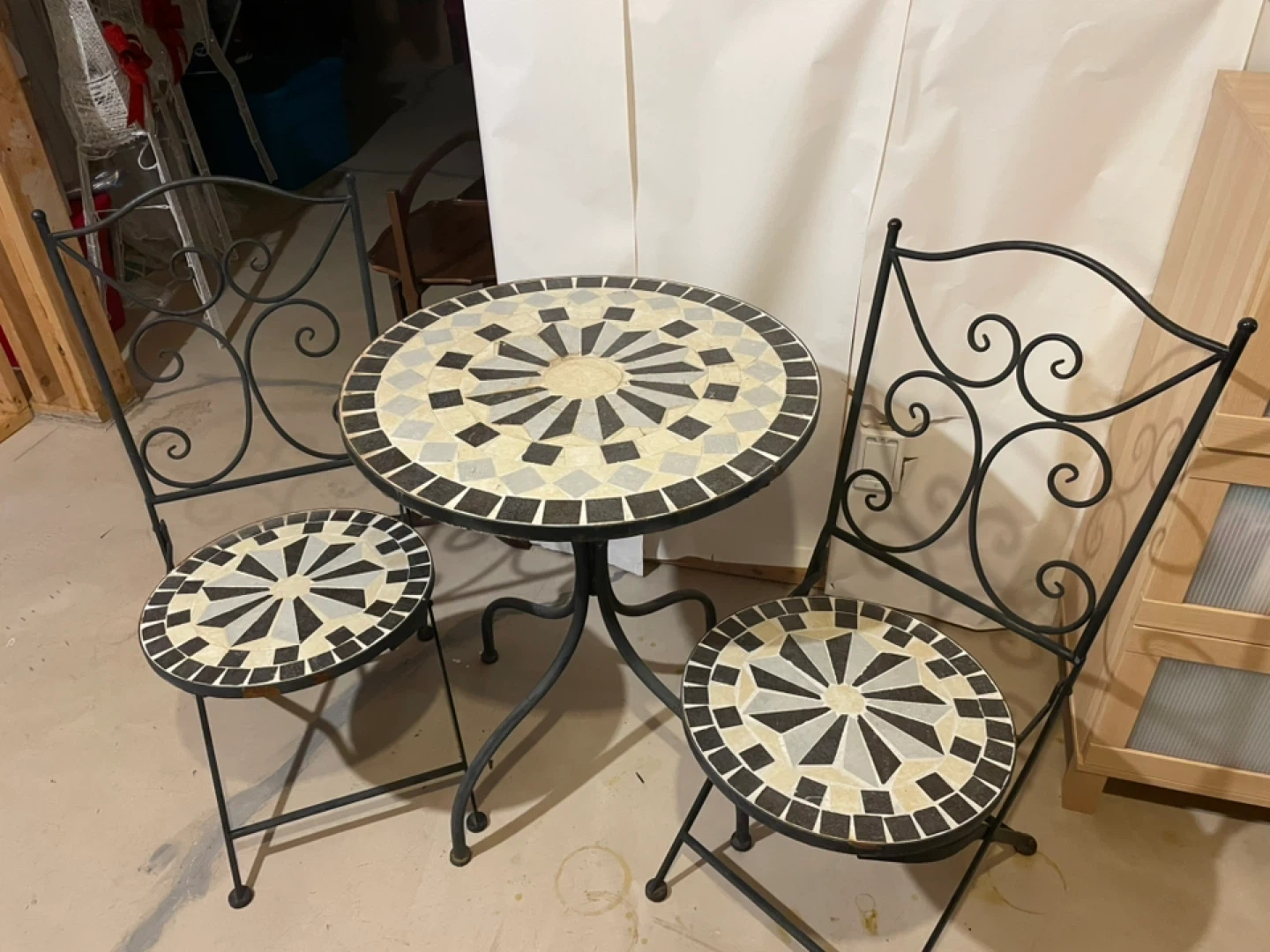 Cute bistro set with a mosaic tabletop and two matching chairs. The set has a wrought iron base and is perfect for a small patio or balcony. There are some signs of wear, but it's still in good condition and ready to add some charm to your outdoor space. This set was outdoors all summer, so the rain has worn areas that’ll need some care. Very heavy.