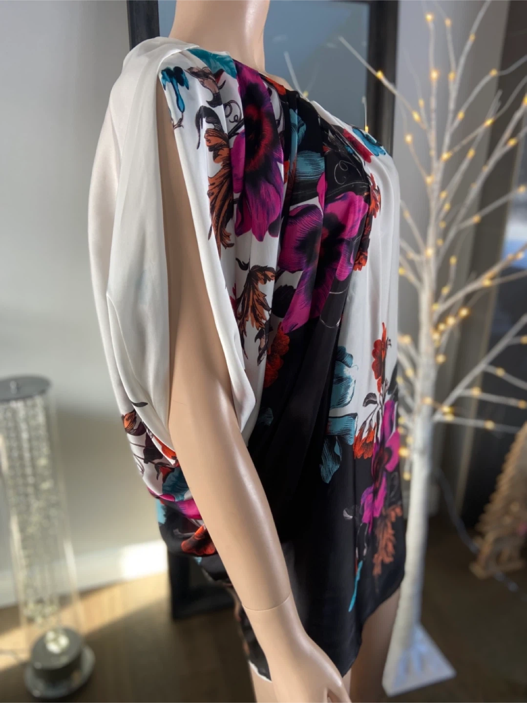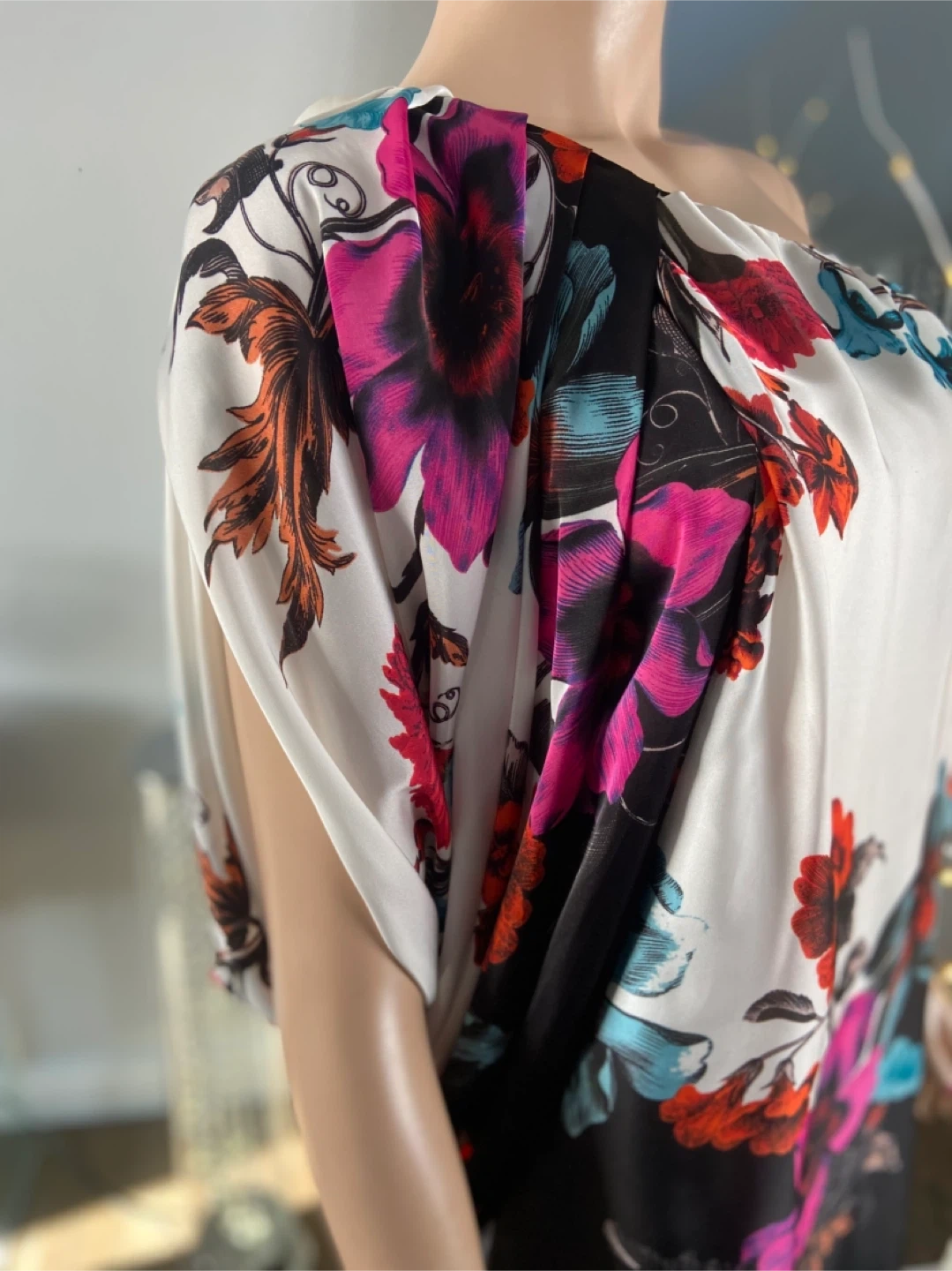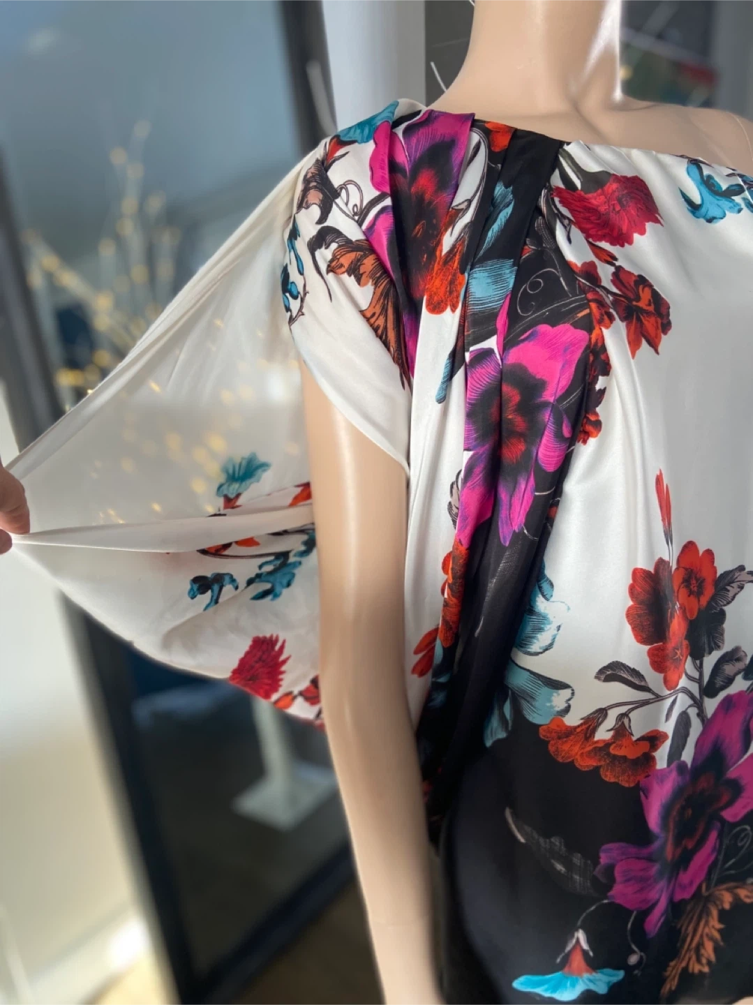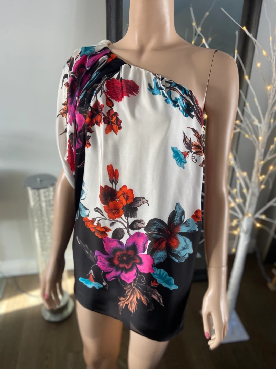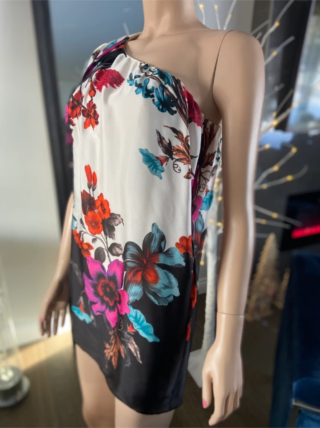 Beautiful floral one-shoulder dress by Aqua in perfect condition and from a smk-free home. The dress features a vibrant floral pattern on a white and black background. Perfect for a special occasion or a night out!
