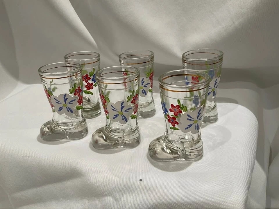 Kitschy vintage Italian liqueur glasses with a floral motif and gold rim. Good condition. Each glass holds 1.5 ounces and is 3 inches tall. From a smoke and pet-free home. Located in Richmond Hill near Bathurst & King Rd.