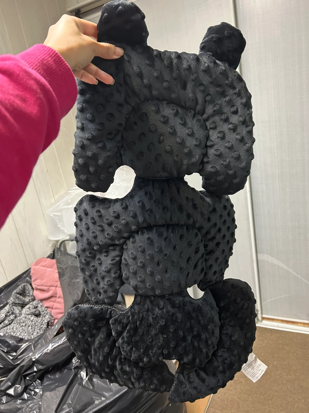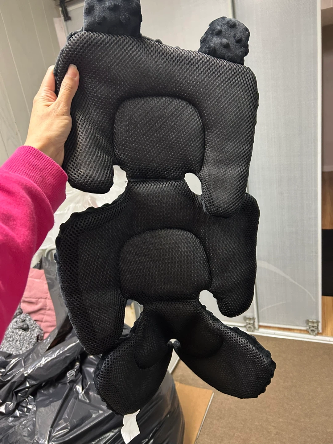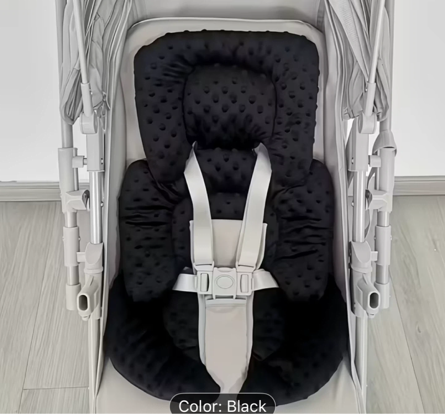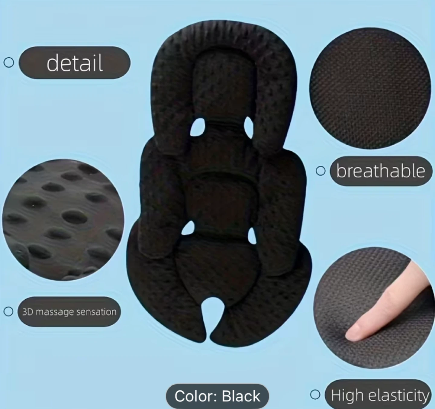 Soft black car seat insert cushion for comfort. It's breathable with a 3D massage sensation and high elasticity. Offers padded head support and a five-point harness design.