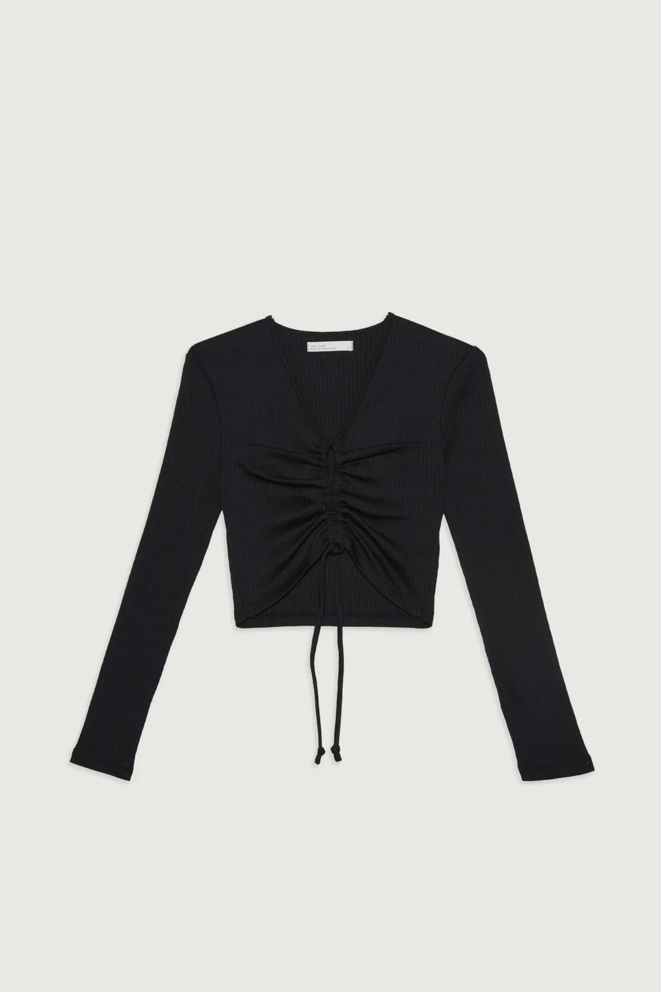 Size medium. This cropped long sleeve top is cut from a ribbed cotton blend in a slim fit. It's gathered at the front with a front cutout and drawstring ties. Wear yours with high-rise trousers and heeled boots.