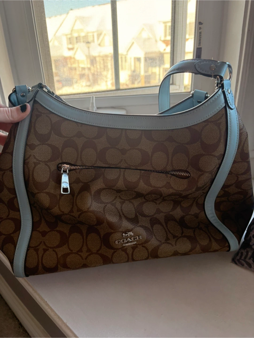 Gently used Coach shoulder bag with the signature Coach pattern. It features light blue trim and a spacious interior with multiple compartments. Small rip inside, could easily be fixed.
