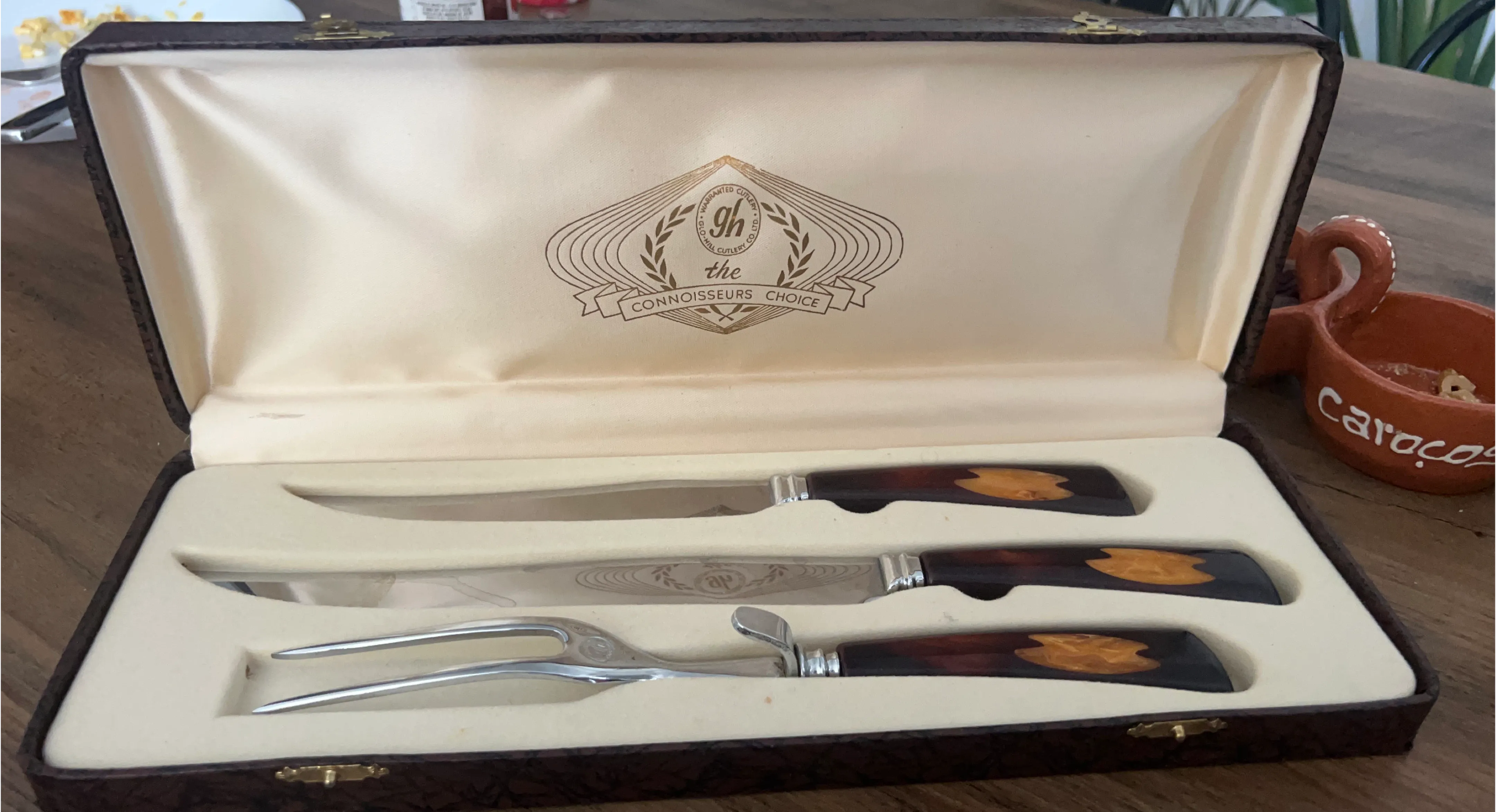 Selling a vintage Glo-Hill carving set, marked as 'The Connoisseurs Choice'! The set includes a carving knife, serving fork, and another knife, all neatly arranged in a presentation box. Perfect for adding a touch of elegance to your dinner service