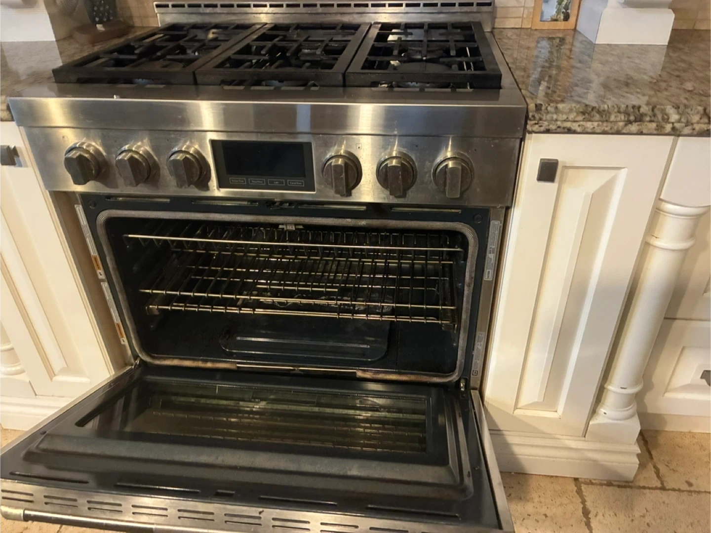 Selling a Jenn-Air stainless steel 36””gas range. It's a great appliance for any kitchen. It shows some signs of use but 6 burners is still in good working condition. Stove is not working requiring electronic repair