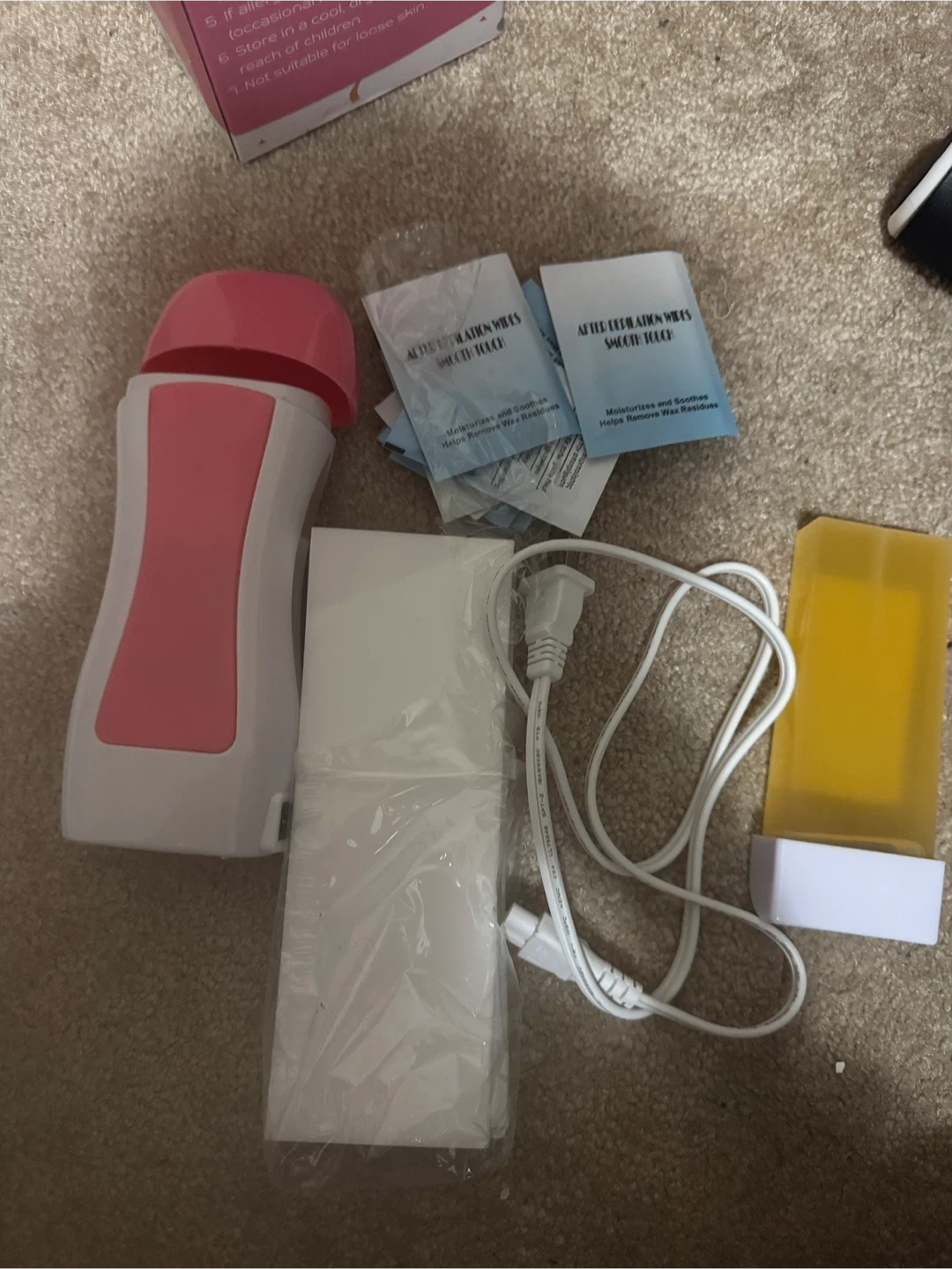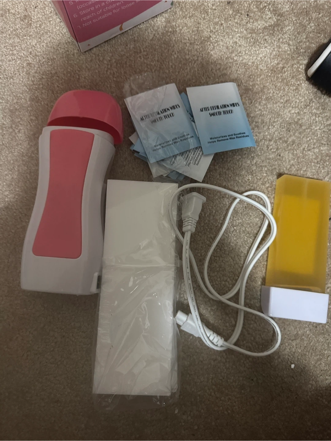 Waxing kit including a wax warmer, wax cartridge, after-depilation wipes, and waxing strips