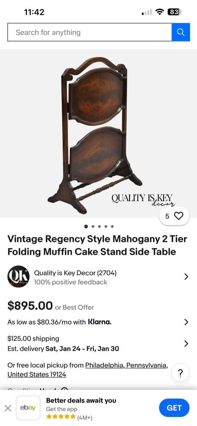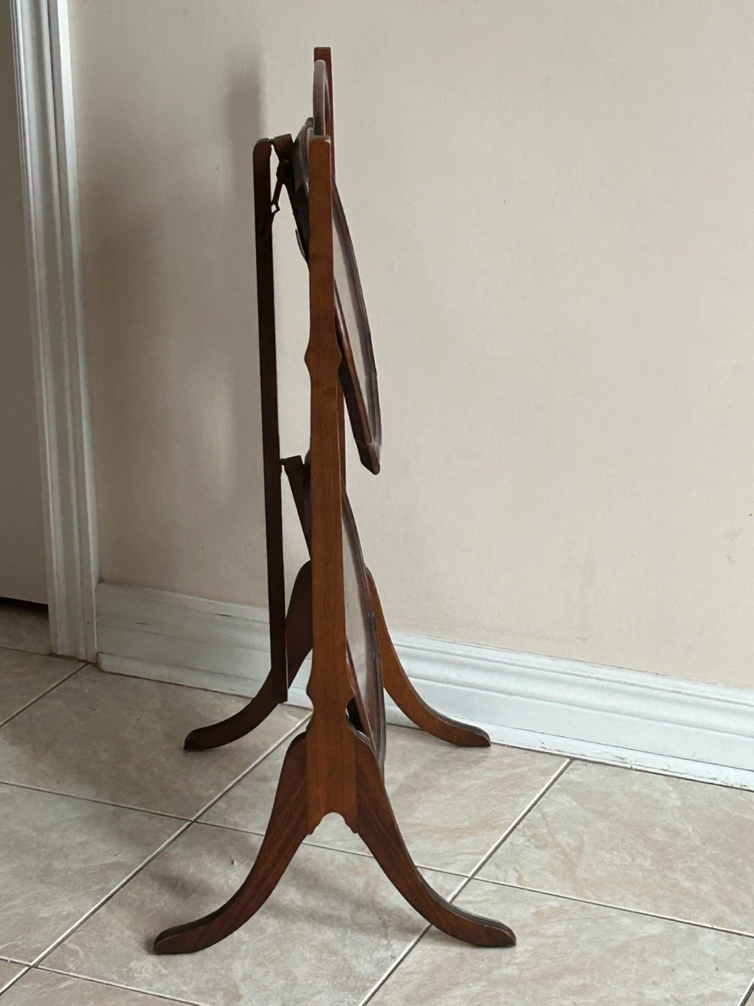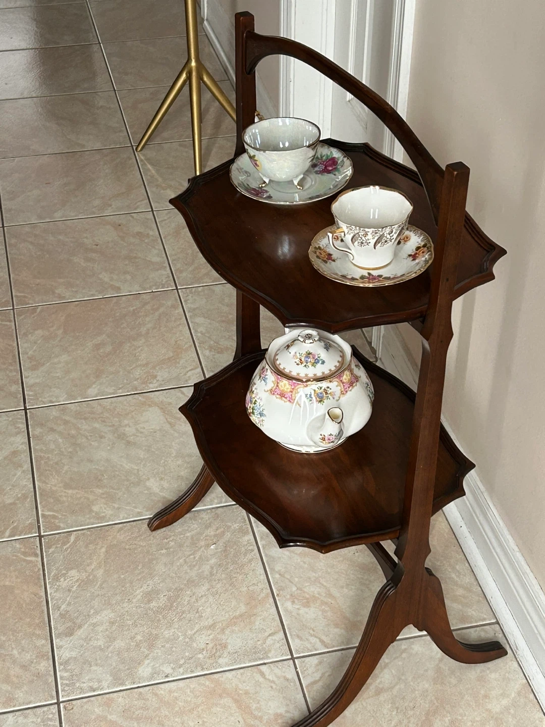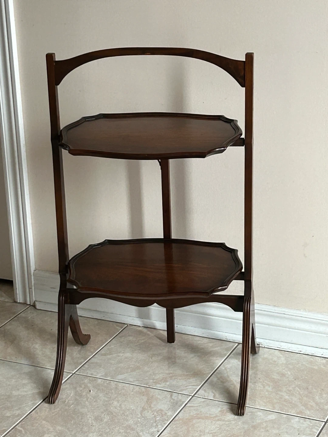 Selling a lovely vintage two-tier tea table. It's made of mahogany and has a beautiful, classic design. Perfect for displaying teacups, plants, or other decorative items!