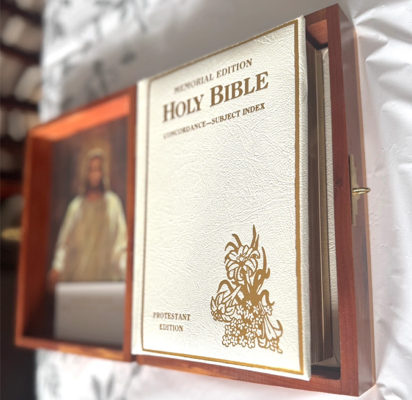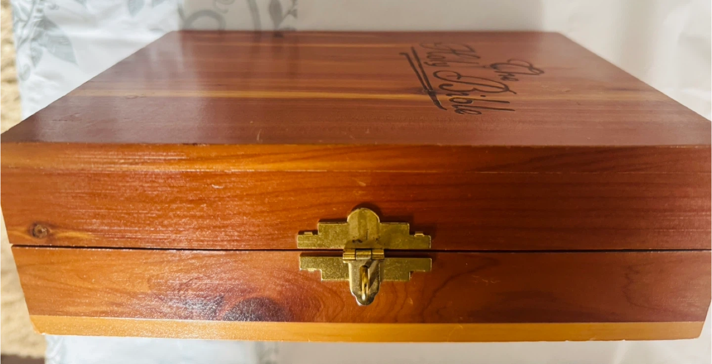 Selling a Memorial Edition Holy Bible that comes in a beautiful wooden box. It's in great condition and ready for a new home. The box features a portrait inside. Perfect for collectors or as a thoughtful gift