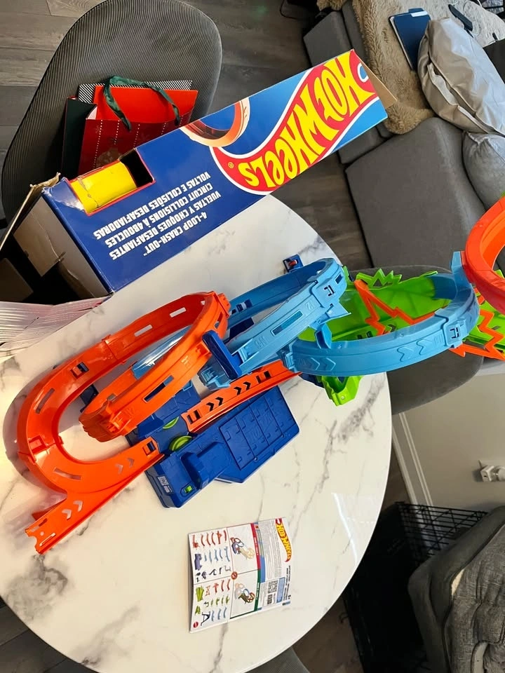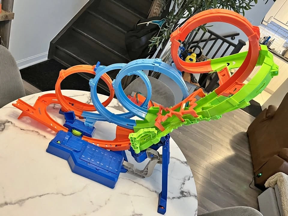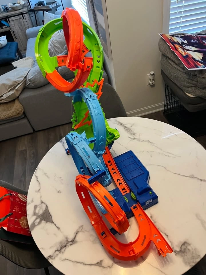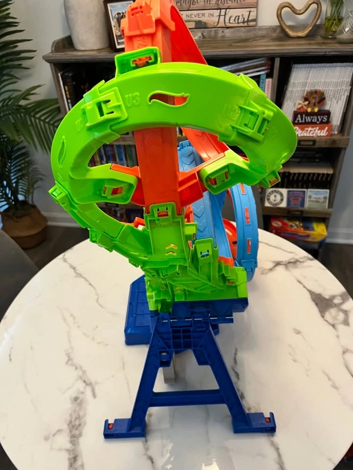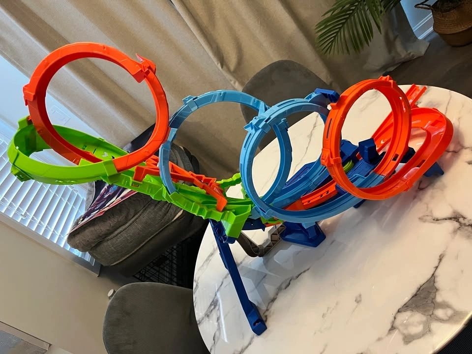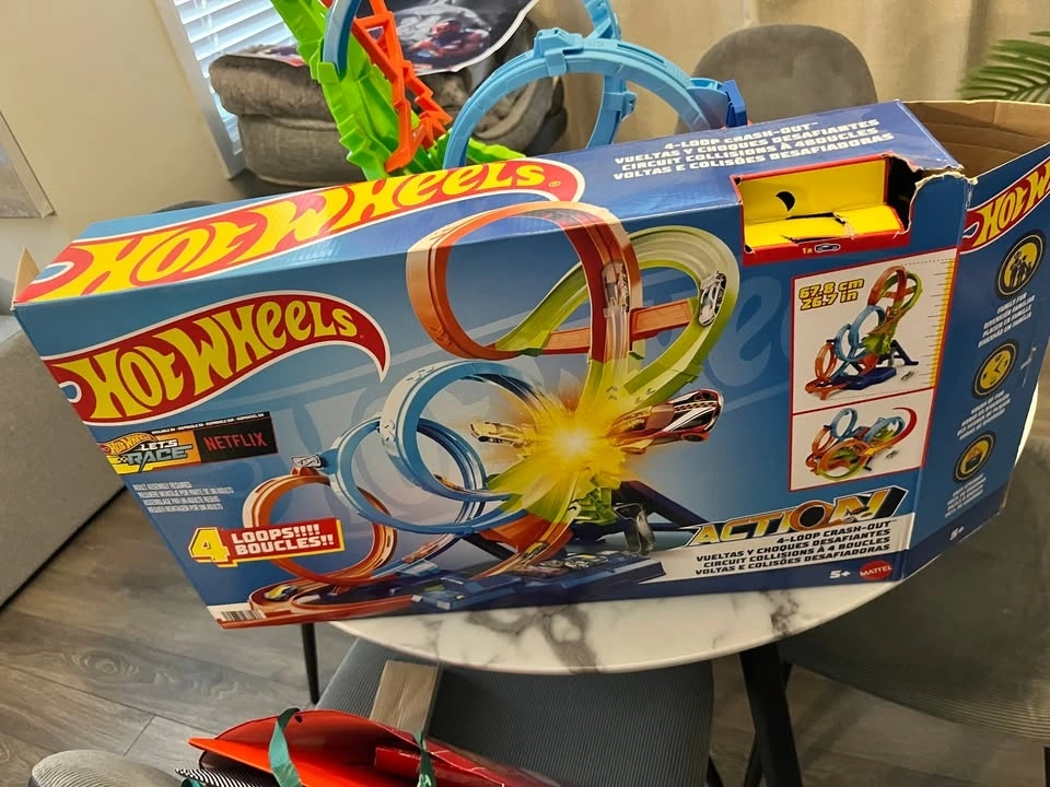 Selling a gently used Hot Wheels "4-Loop Crash-Out" motorized track set. This is an action-packed set where cars race through four massive loops until they eventually crash in the center. It stands about 26.7 inches tall.