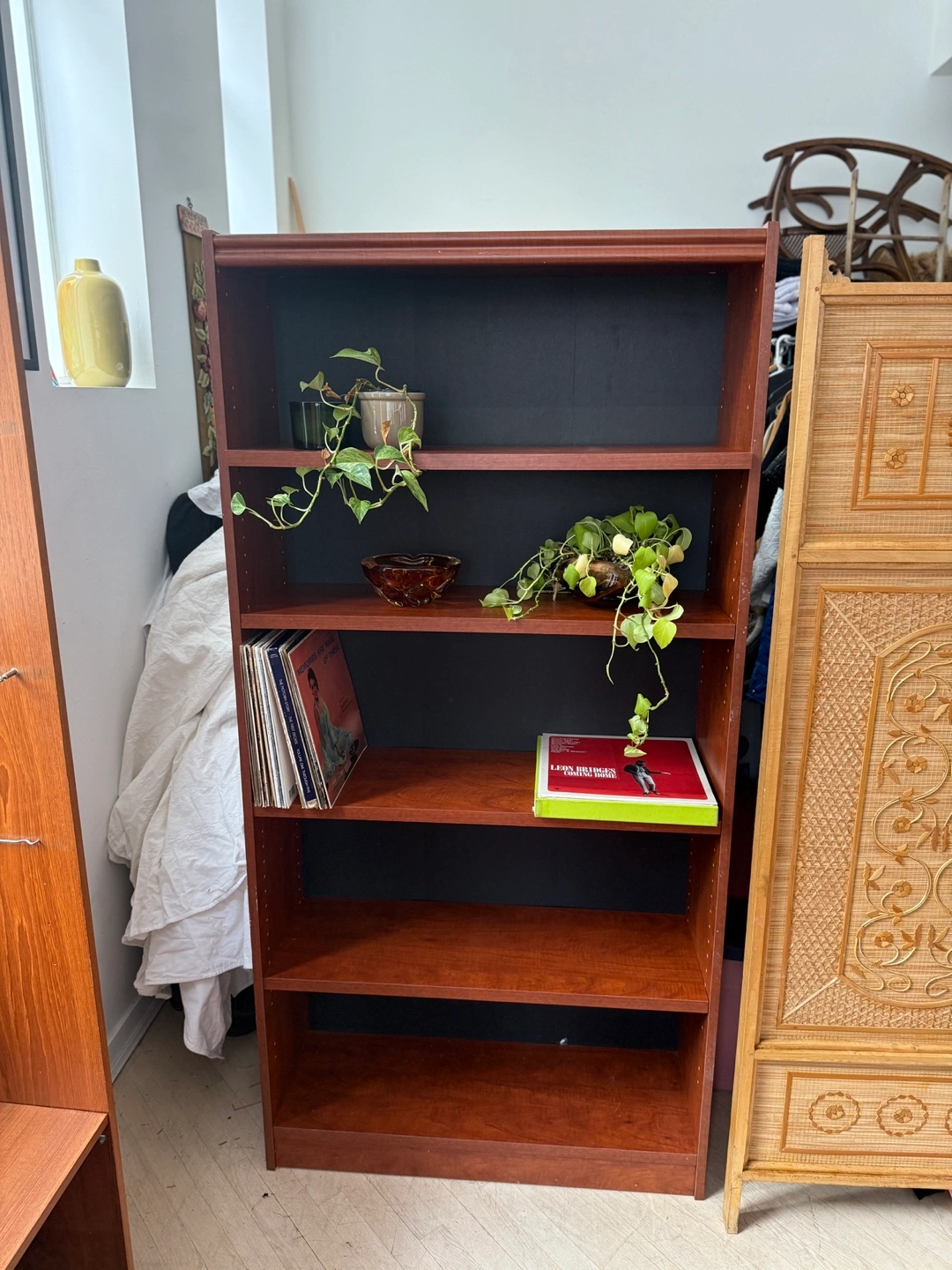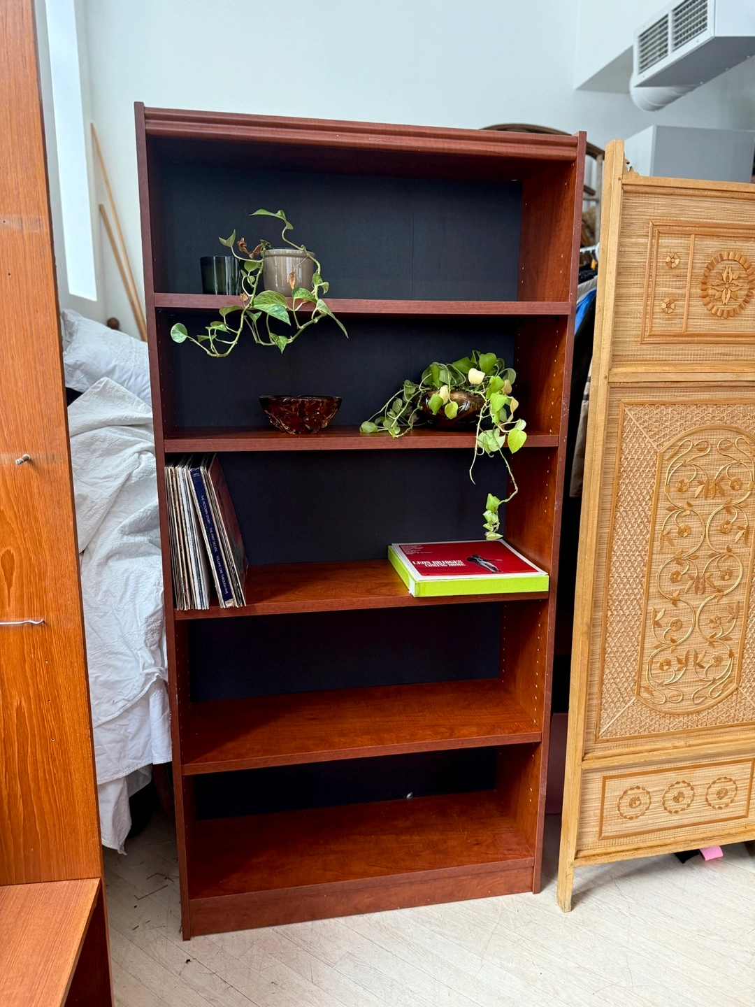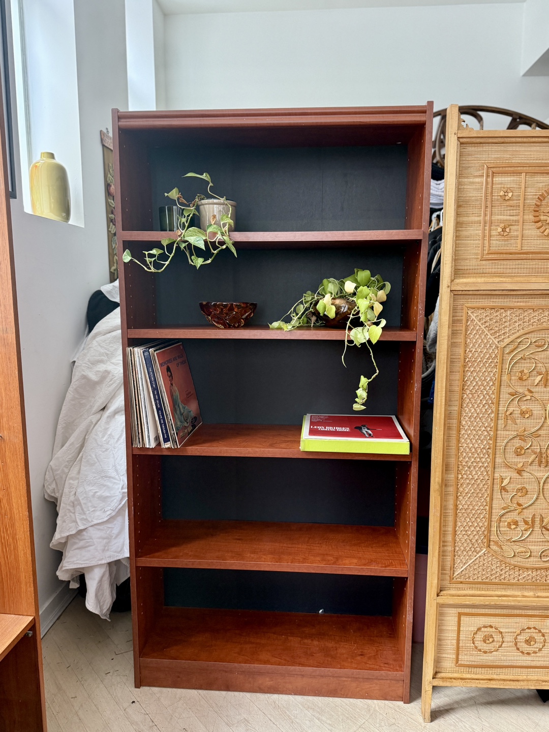 Sturdy, clean-lined bookshelf with fully adjustable shelves. Not solid wood, but very solid and well-built β no wobble, no flimsy backing. Perfect for books, records, baskets, plants, or office storage.