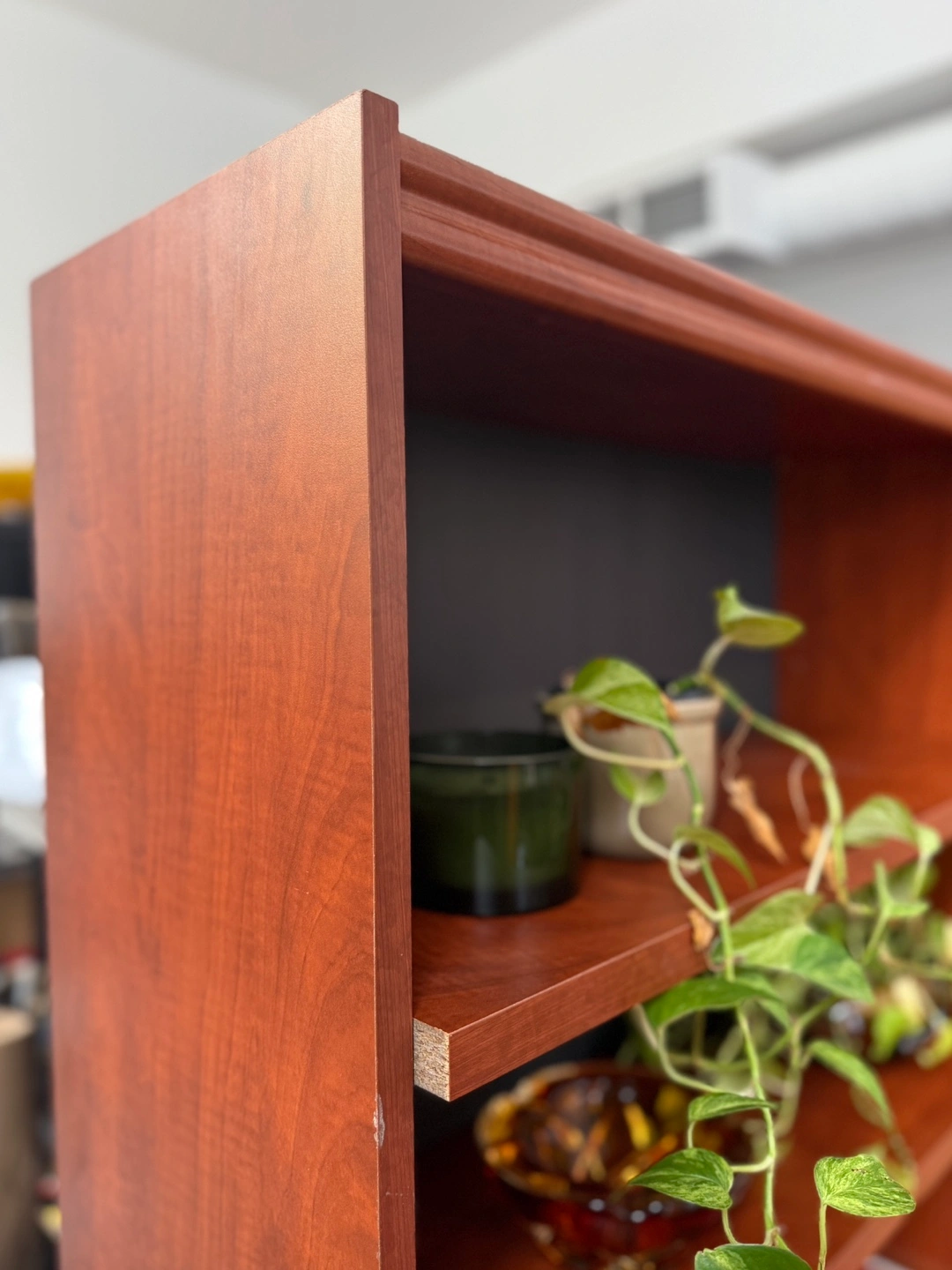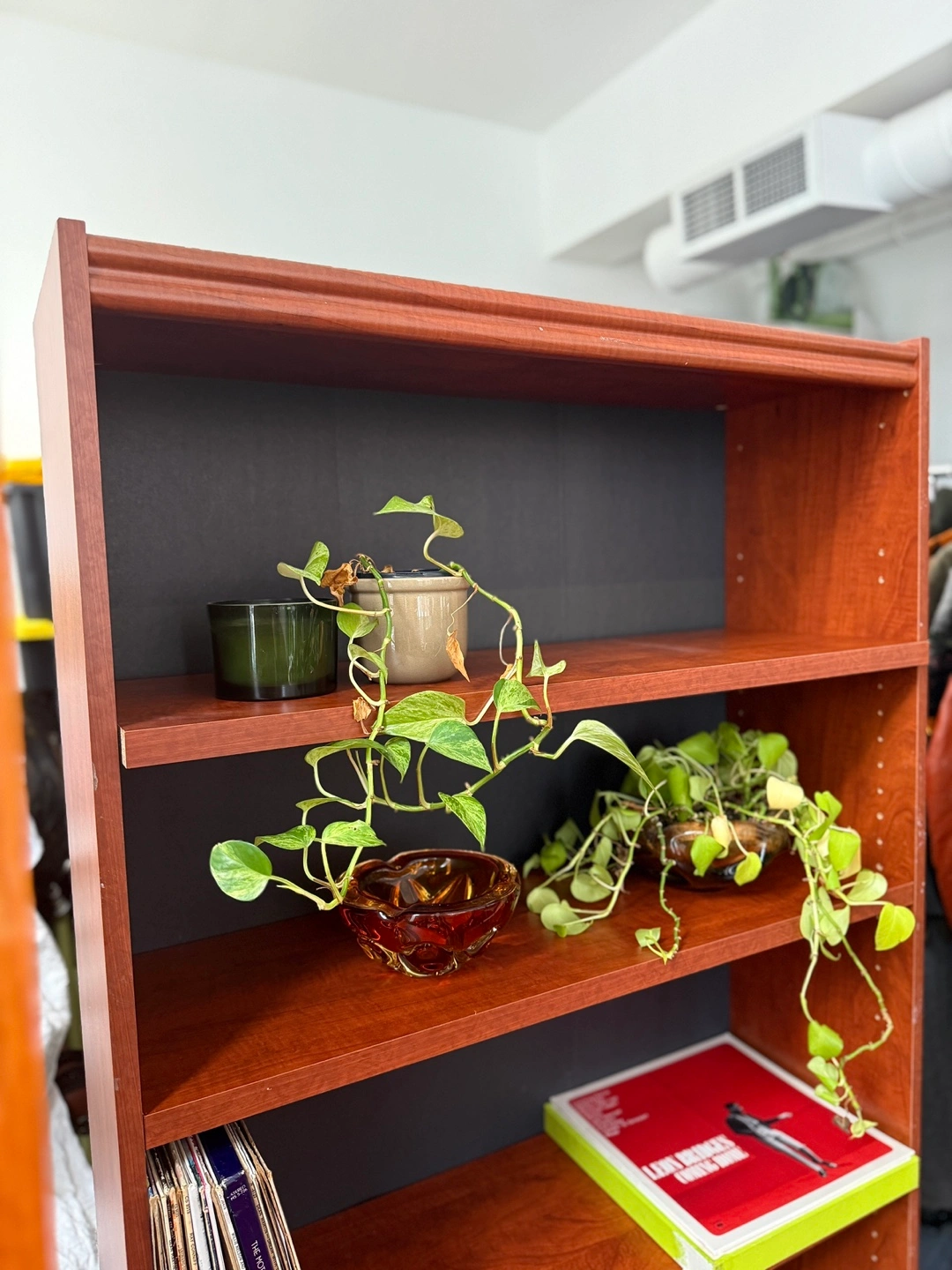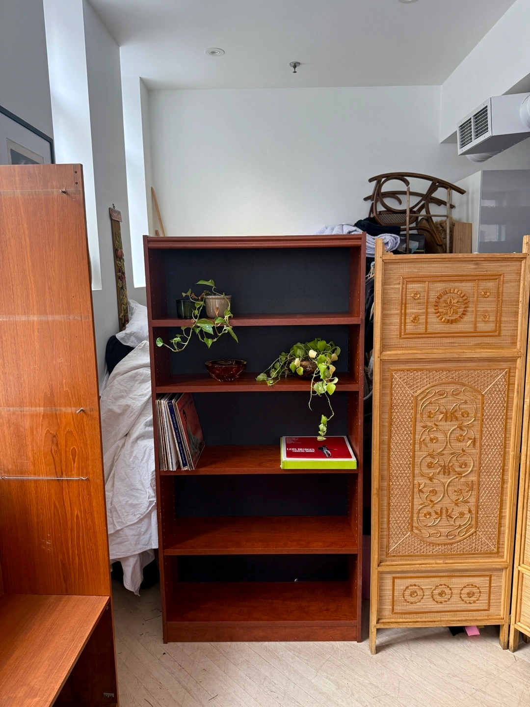 Sturdy, clean-lined bookshelf with fully adjustable shelves. Not solid wood, but very solid and well-built β no wobble, no flimsy backing. Perfect for books, records, baskets, plants, or office storage.