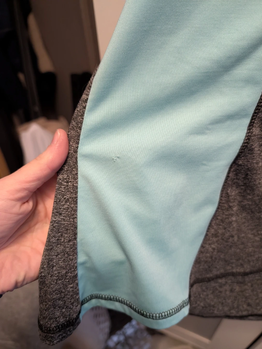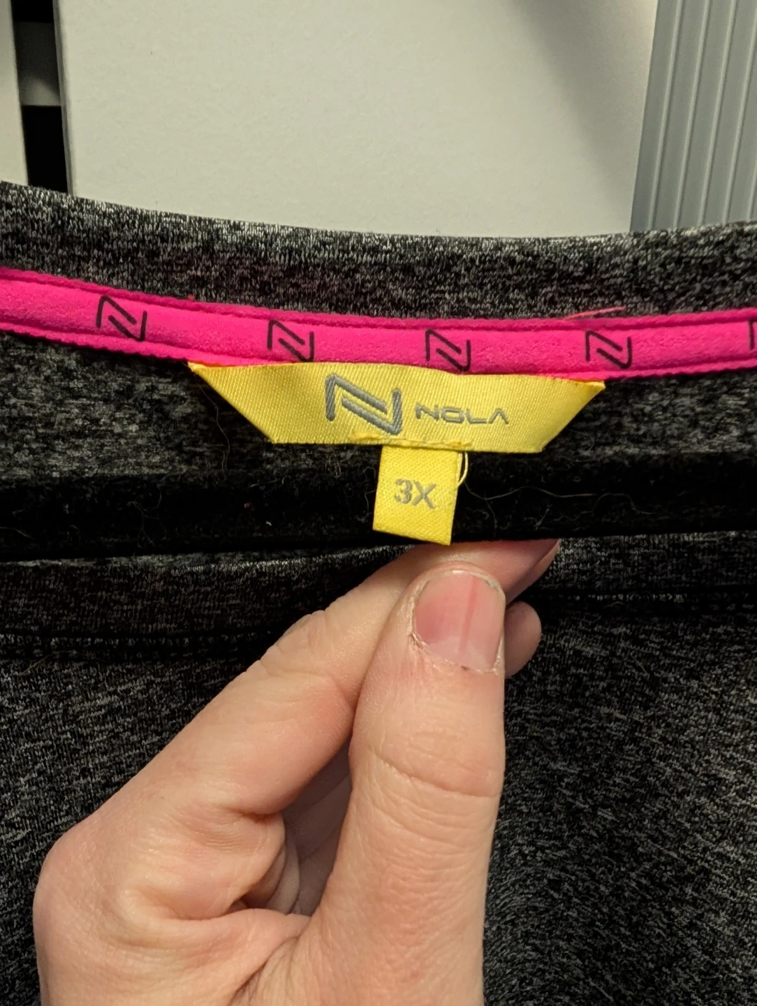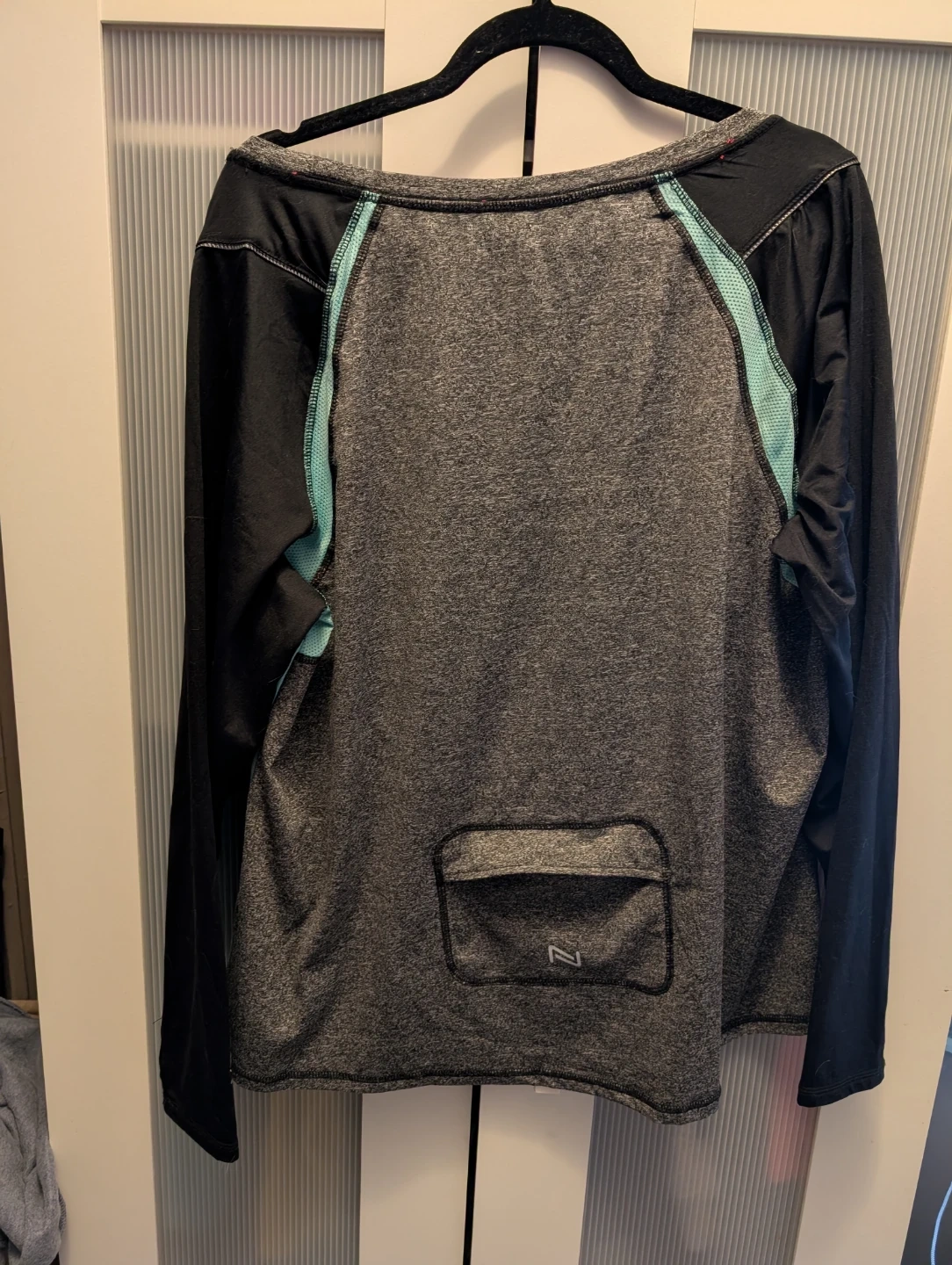 Selling a NOLA activewear top in size 3X. It features a unique colourblock design with black sleeves, grey body, and light blue accents. There is a small imperfection on the light blue section, as shown in the photos. Great for workouts or casual wear!