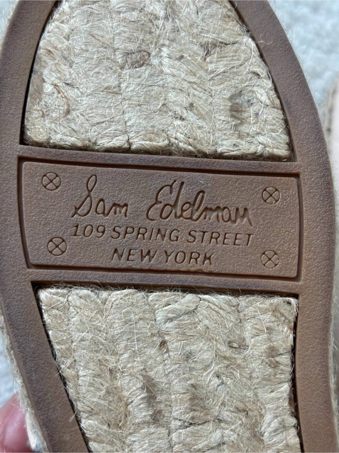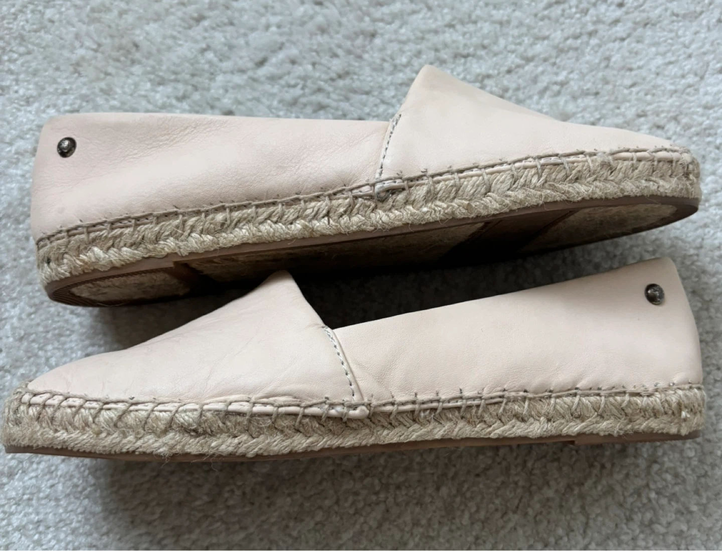 Selling a new pair of Sam Edelman Lynn espadrille flats in size 7.5M. They are a lovely light tan (slight pinkish hue) colour and made with a leather upper. Perfect for adding a touch of casual elegance to your everyday look! Sitting in my closet for a few years, name lifted on inside “pleather” piece when I tried on yesterday, these are lovely, just don’t fit. Clearing closet