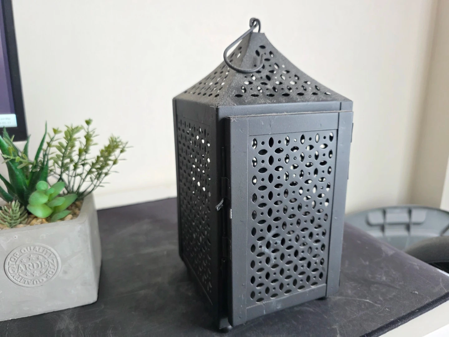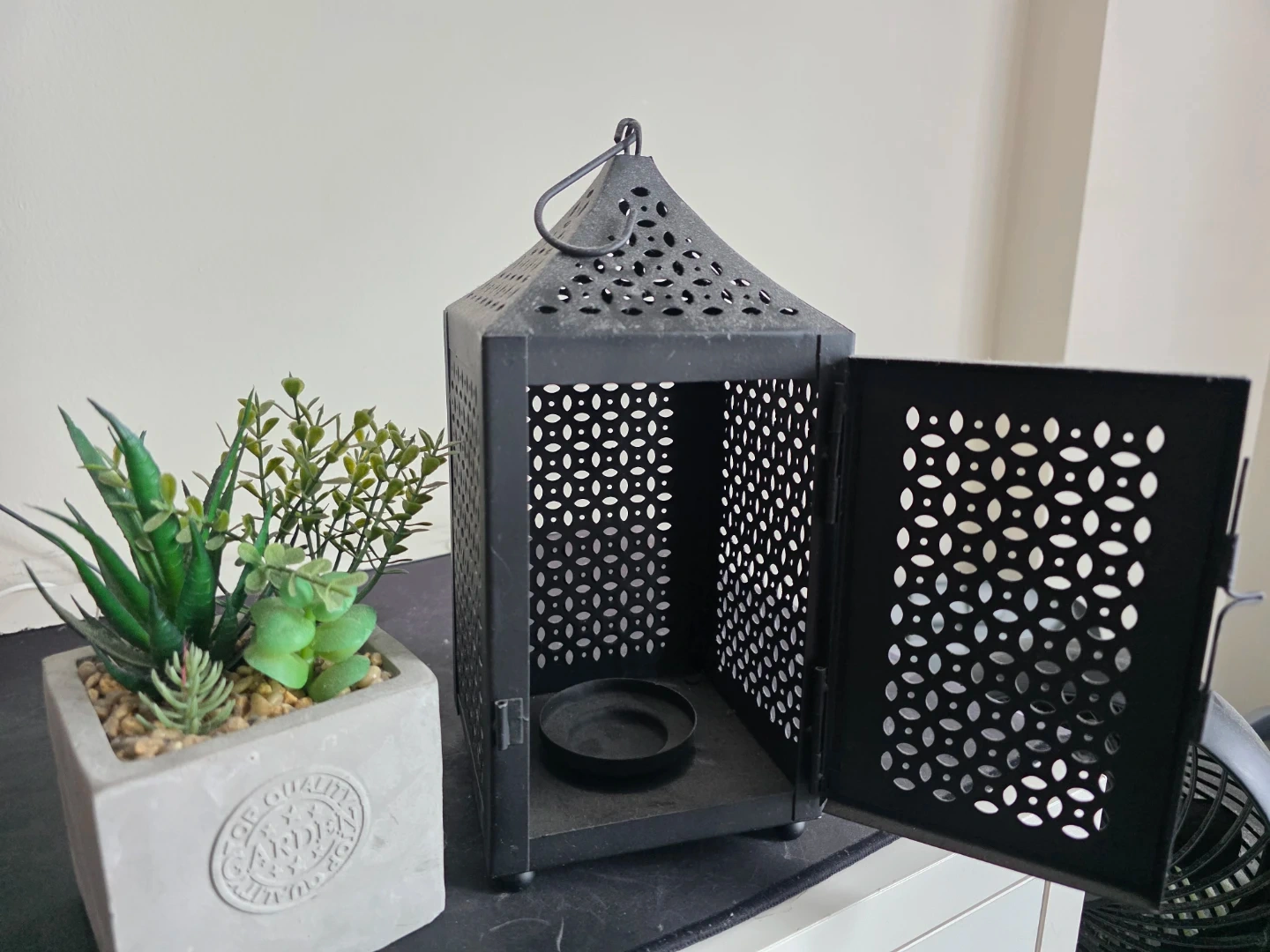 Here's a lovely black metal candle lantern, perfect for adding a touch of cozy ambiance to any room! It's in great shape and ready to light up your space