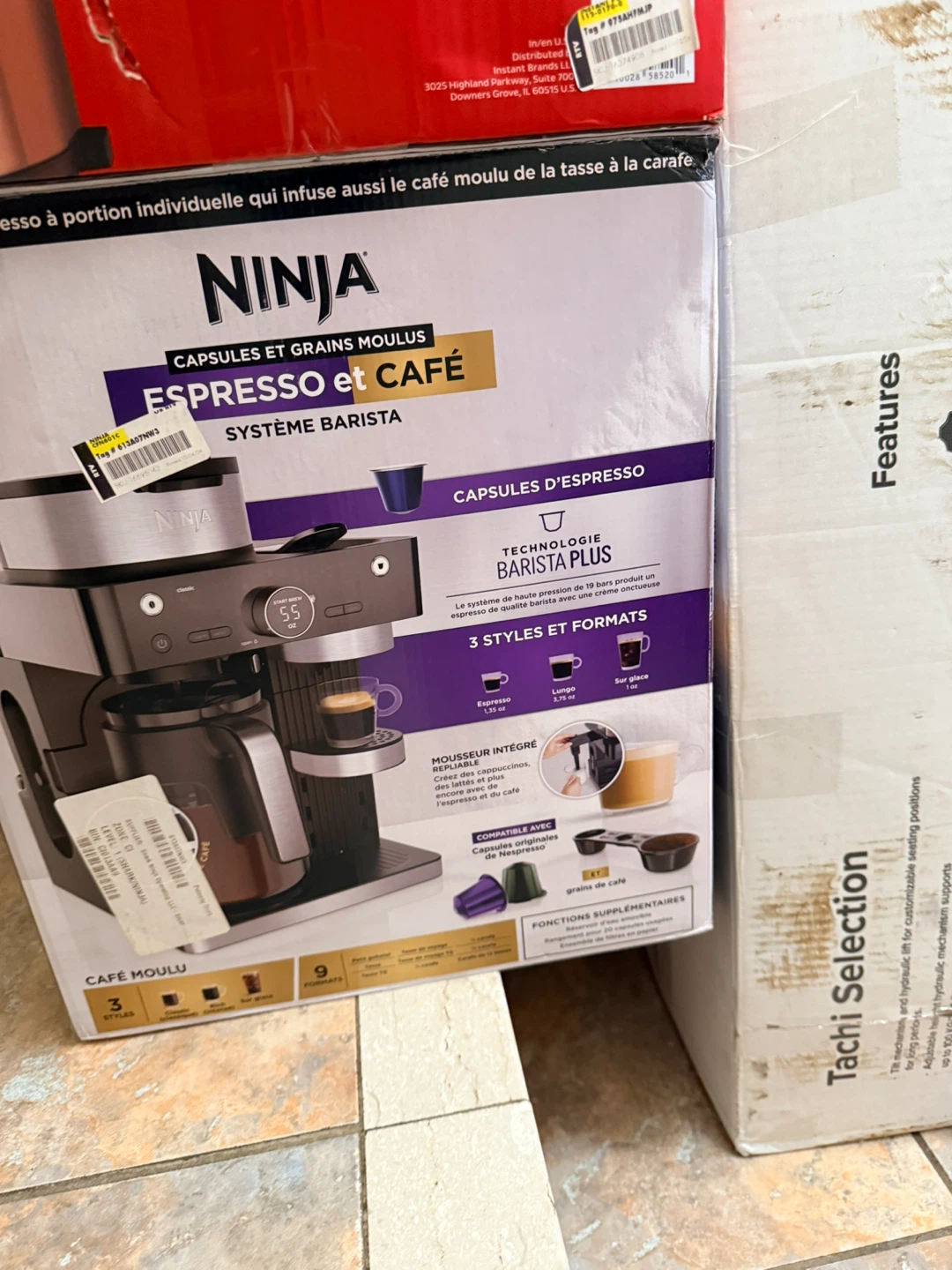 Selling a Ninja Espresso et Café System Barista. It's compatible with Nespresso capsules and coffee grounds. It has 3 styles and 9 formats. The system has a 19 bar pressure system for quality barista espresso. It also features an integrated folding frother
