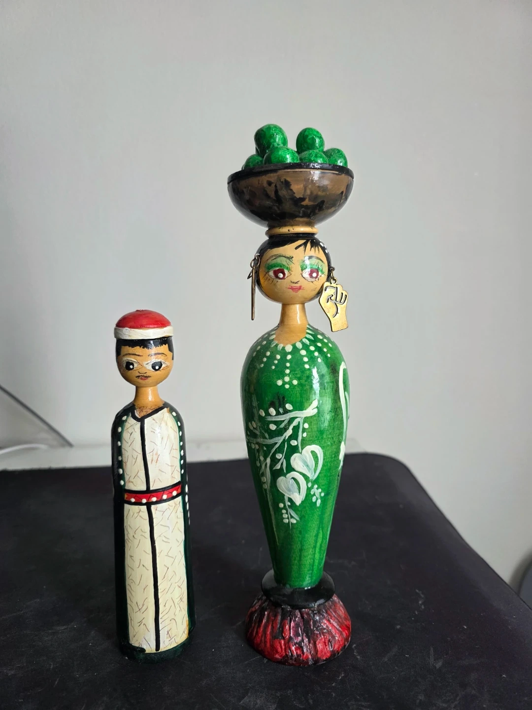 I'm selling two hand-carved Egyptian wooden doll figurines. One is a taller green figurine with a bowl on its head. The other is a shorter figurine with a white and black robe. They're both in great condition and would be a lovely addition to any collection
