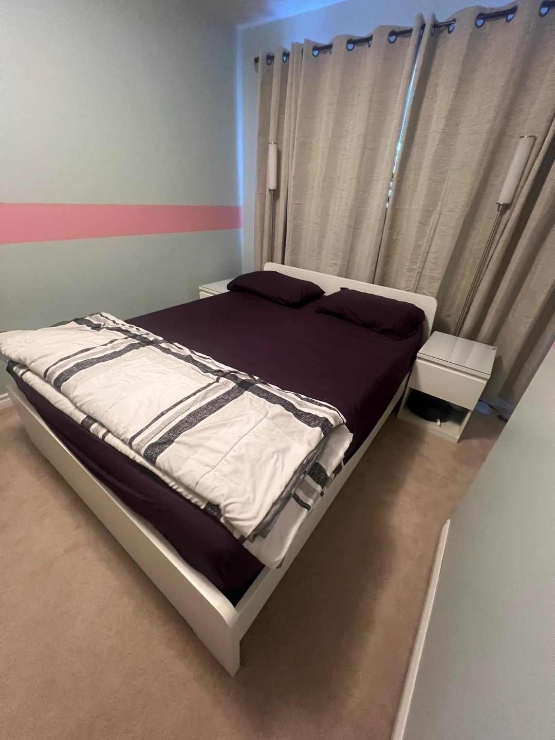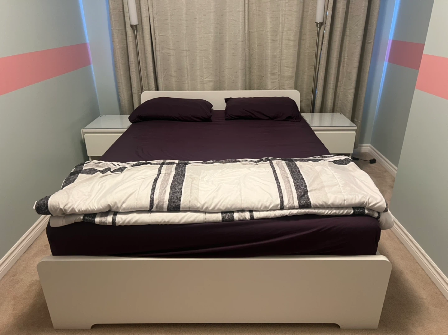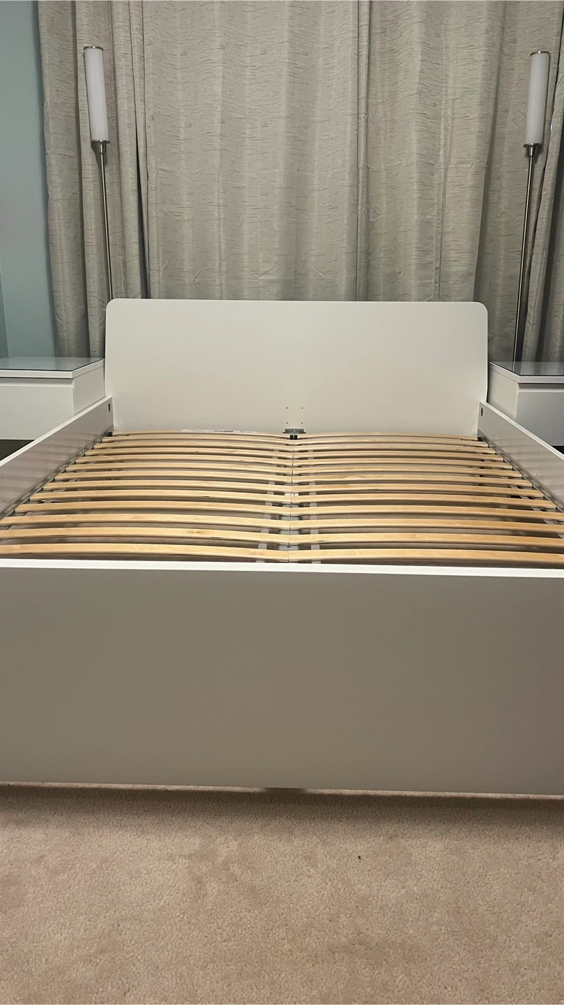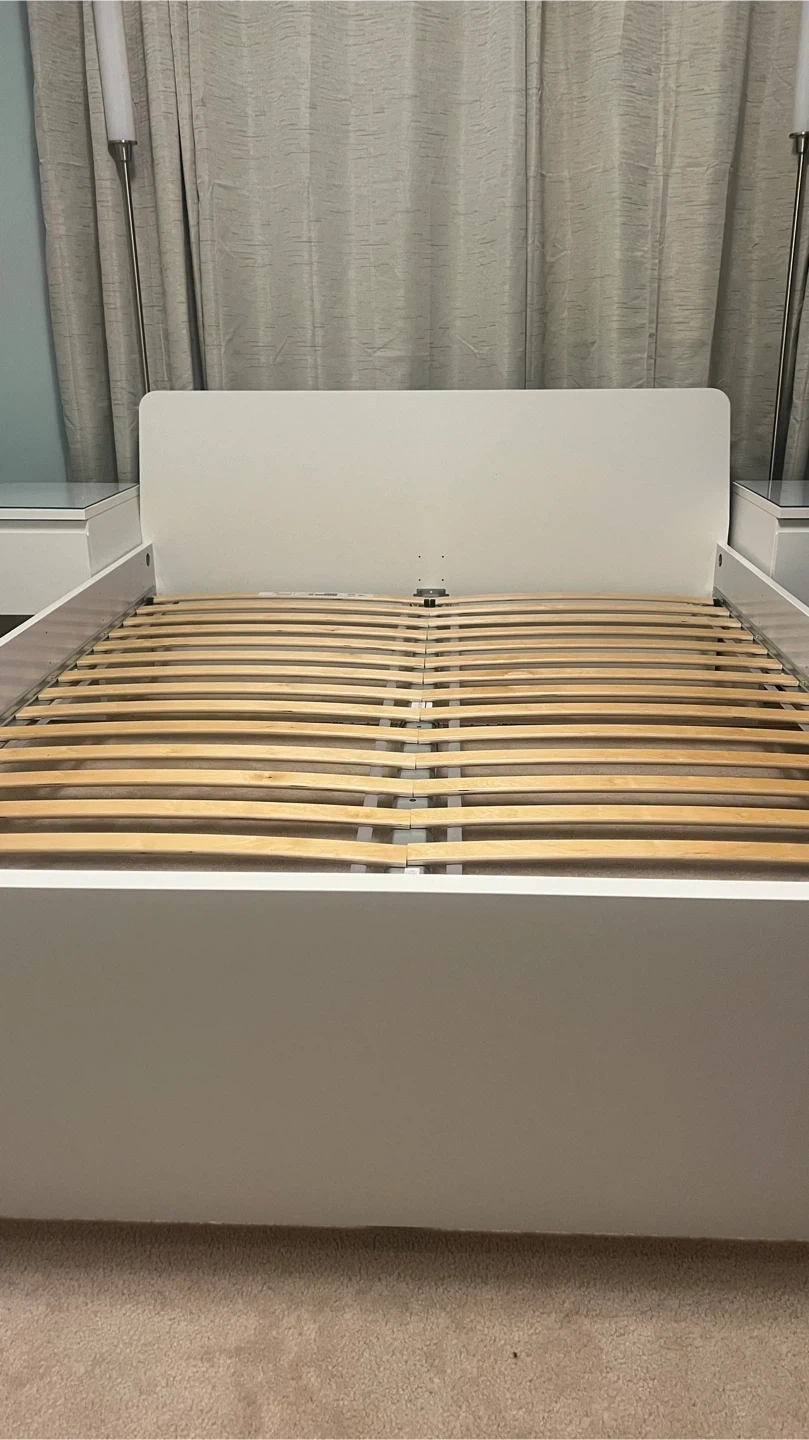 Selling a white IKEA Malm queen bed frame. It's in great shape and ready for a new home! Perfect for adding a clean and modern look to your bedroom. Easy to assemble and disassemble, making it convenient for moving