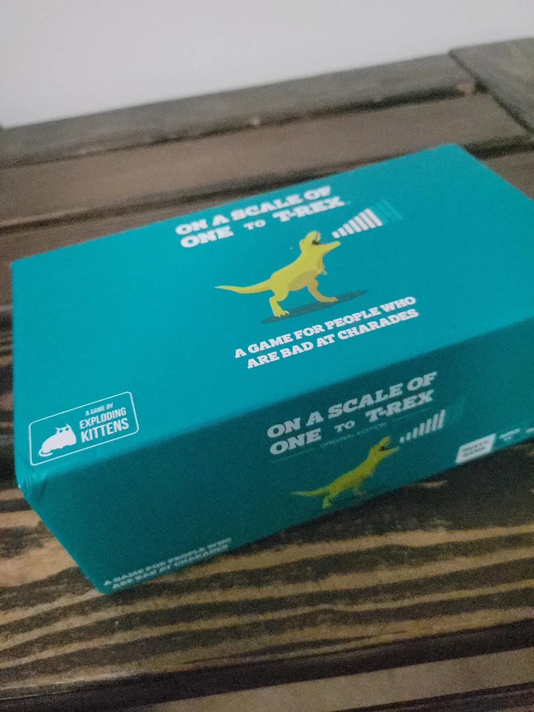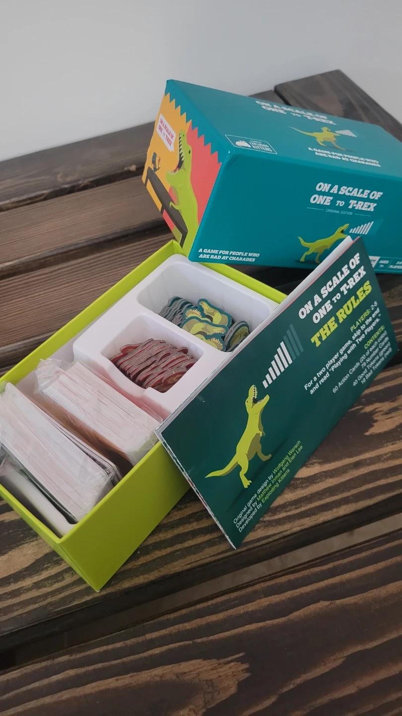Selling the On a Scale of One to T-Rex game by Exploring Kittens! It's a game for people who are bad at charades. The box includes action cards and rule cards, for two or more players.