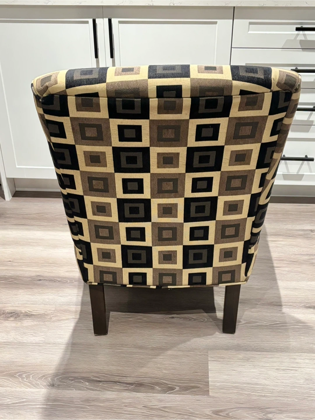 Stylish accent chair with a unique geometric pattern in shades of black, brown, and beige. Great for adding a touch of flair to any room.