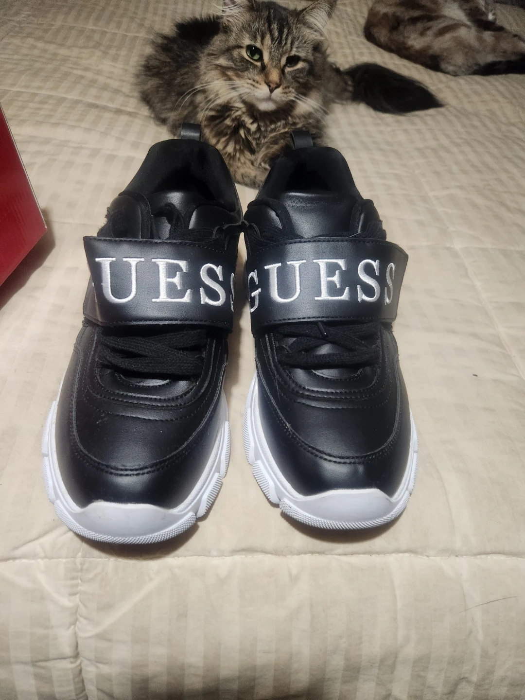 These Guess GFKathie sneakers are perfect for adding a stylish touch to your outfit! They come in women's size 10 and feature a sleek black design with a white sole. The box is included!