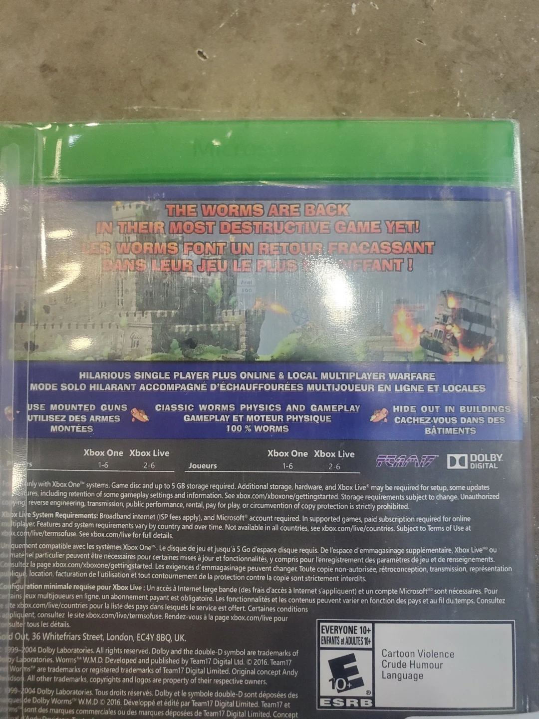 Selling Worms W.M.D. All-Stars for Xbox One! It's a hilarious single-player plus online & local multiplayer warfare game. You can use mounted guns, and enjoy classic worms physics and gameplay. Everyone 10+ can enjoy this cartoon violence, crude humour and language.