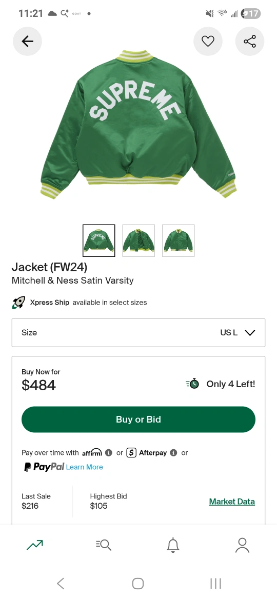 Selling a Supreme x Mitchell & Ness Satin Varsity Jacket in green, size US L. It's in great condition and ready for a new owner!