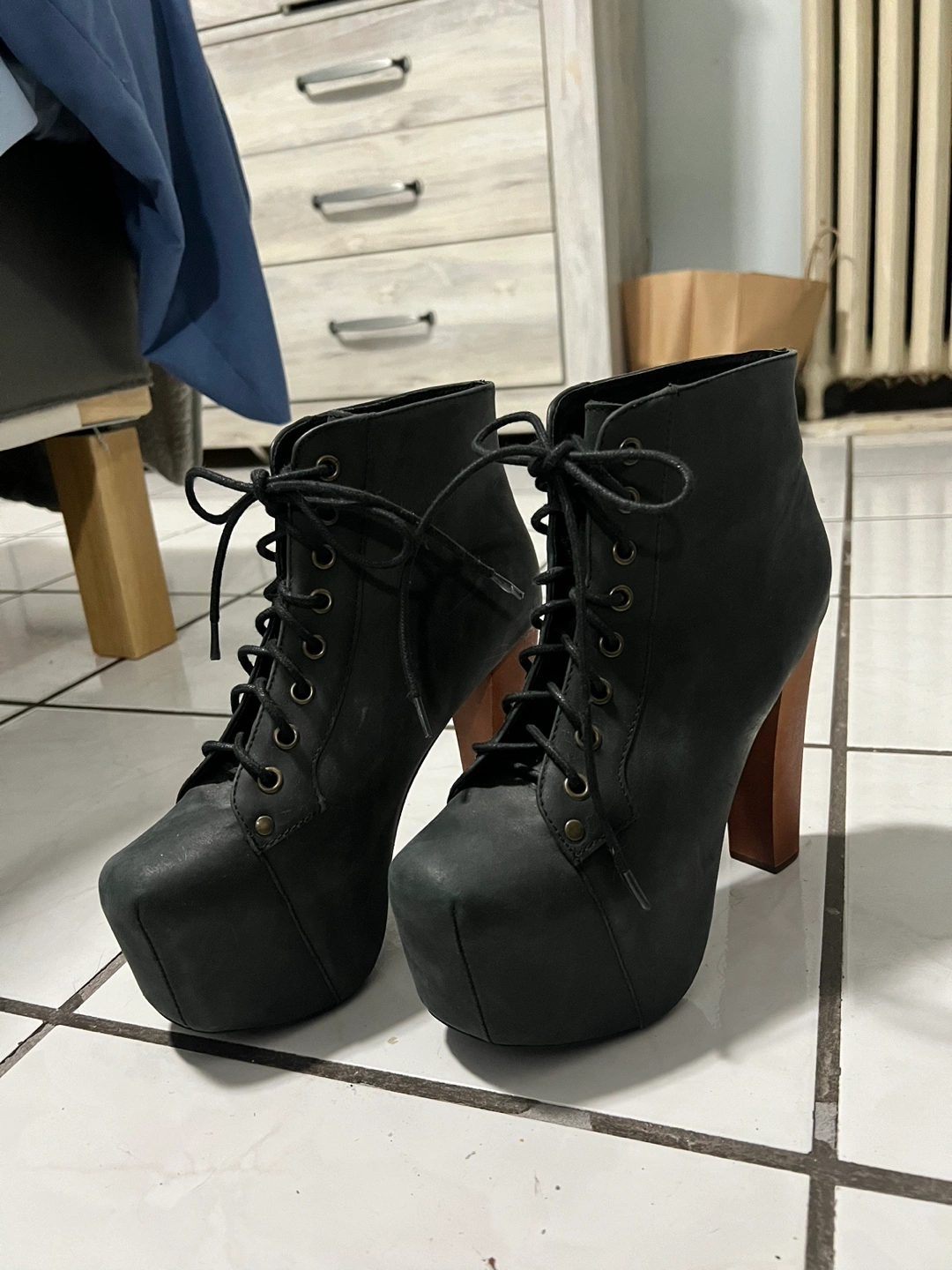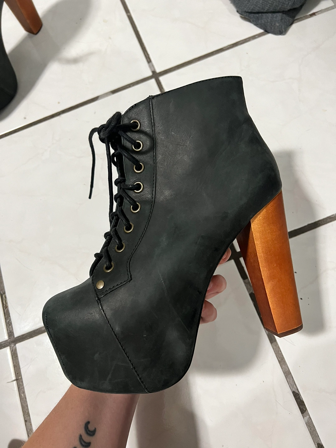 Only worn a few times - vintage Jeffrey Campbell wooden heel platform boots circa 2010, fantastic condition. women size 8.