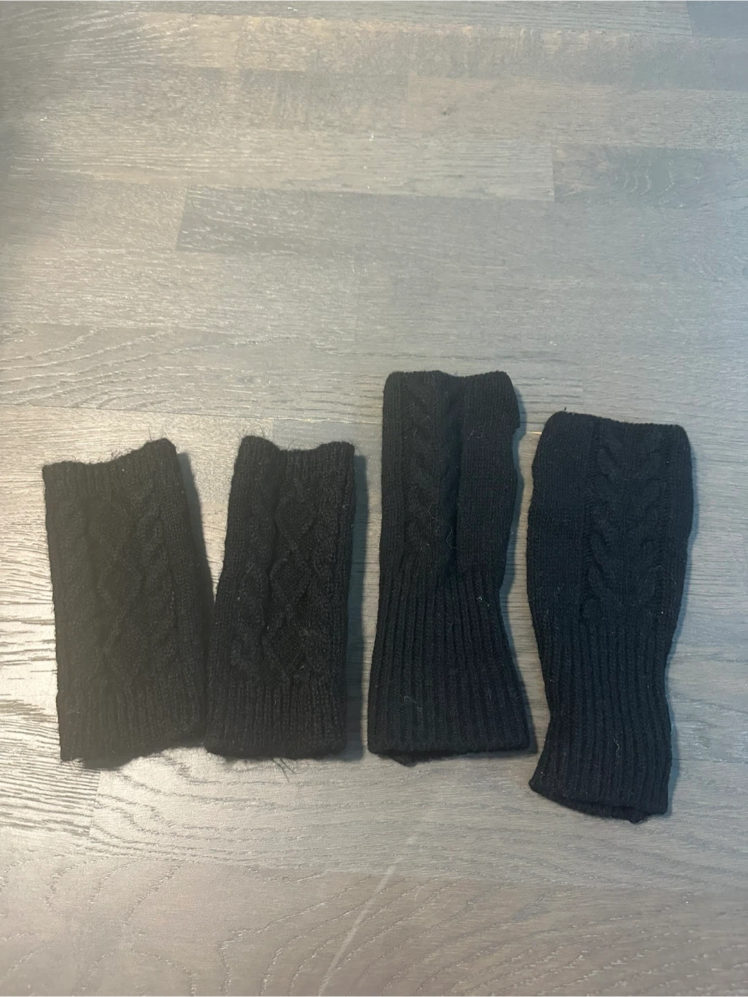 Selling a pair of gently used black knit fingerless gloves. They're perfect for keeping your hands warm while still allowing you to use your phone or other devices. They have a nice cable knit pattern and are in great condition