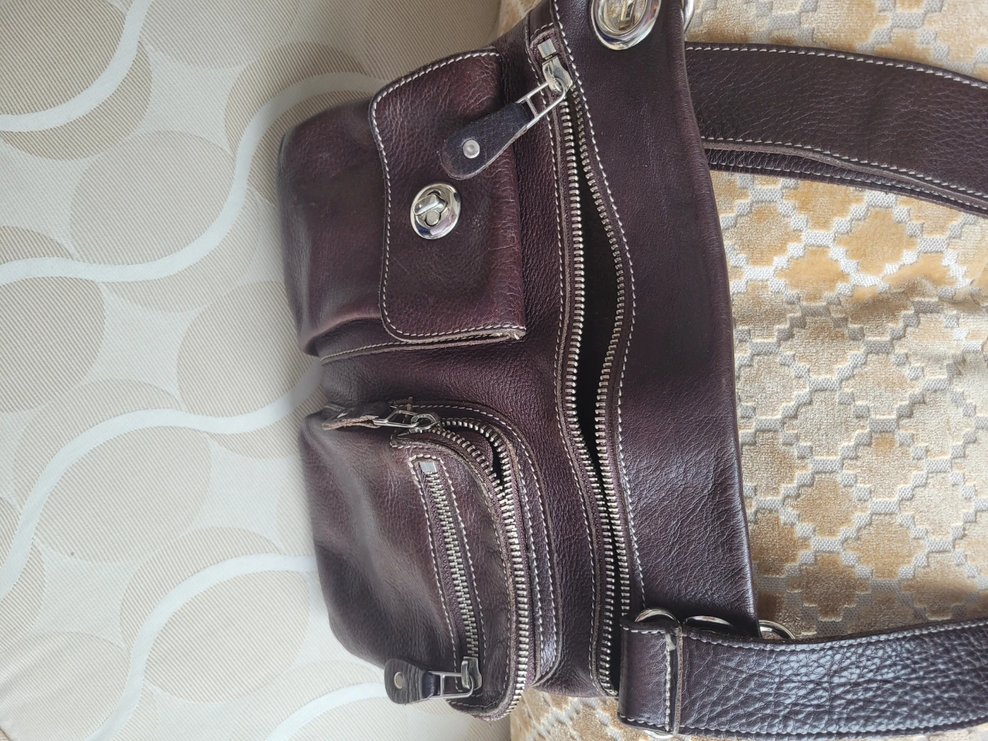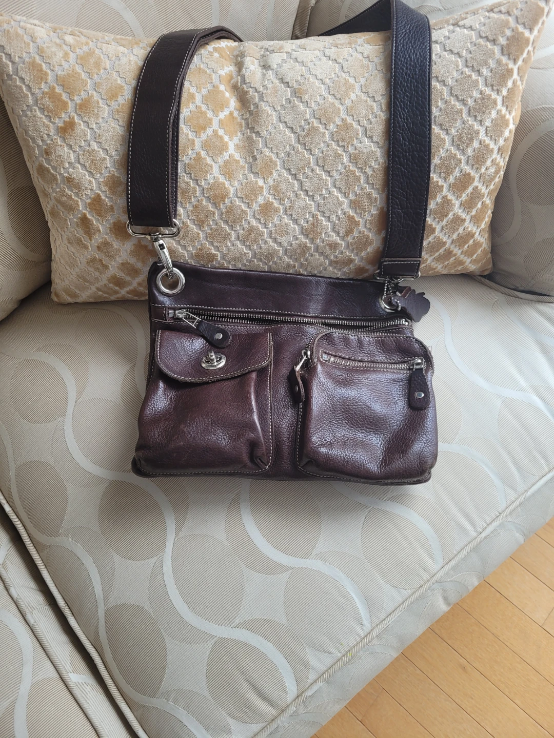 Roots Brown Leather Crossbody Tribe bag. It features multiple zippered pockets on the front and a comfortable shoulder strap. It's in good pre-loved condition and perfect for everyday use!