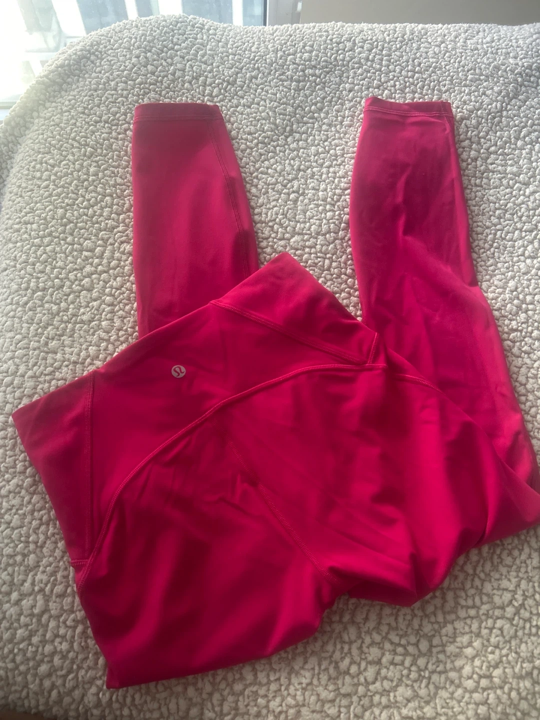 Selling a pair of Lululemon leggings in a vibrant hot pink colour! They are size 6 and in great condition. Perfect for yoga, running, or just lounging around. The design features a flattering high waist and a comfortable fit. These leggings are made with Lululemon's signature breathable and stretchy fabric, ensuring maximum comfort and flexibility during any activity